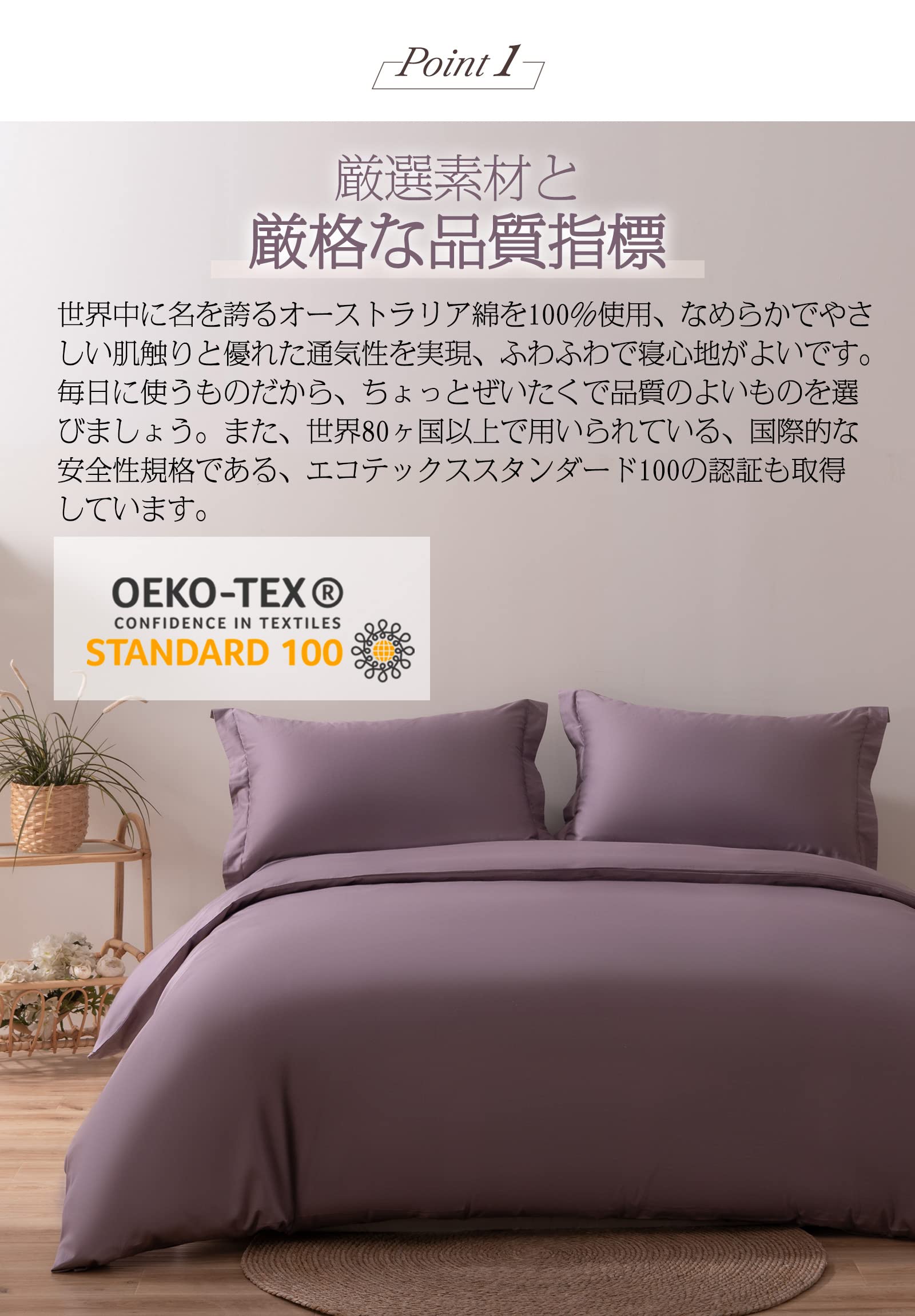 【厳選素材と厳格な品質指標】世界中に名を誇るオーストラリア綿を100%使用、なめらかでやさしい肌触りと優れた通気性を実現、ふわふわで寝心地がよいです。毎日に使うものだから、ちょっとぜいたくで品質のよいものを選びましょう。国際的な安全基準OEKO-TEX認証も取得済み。