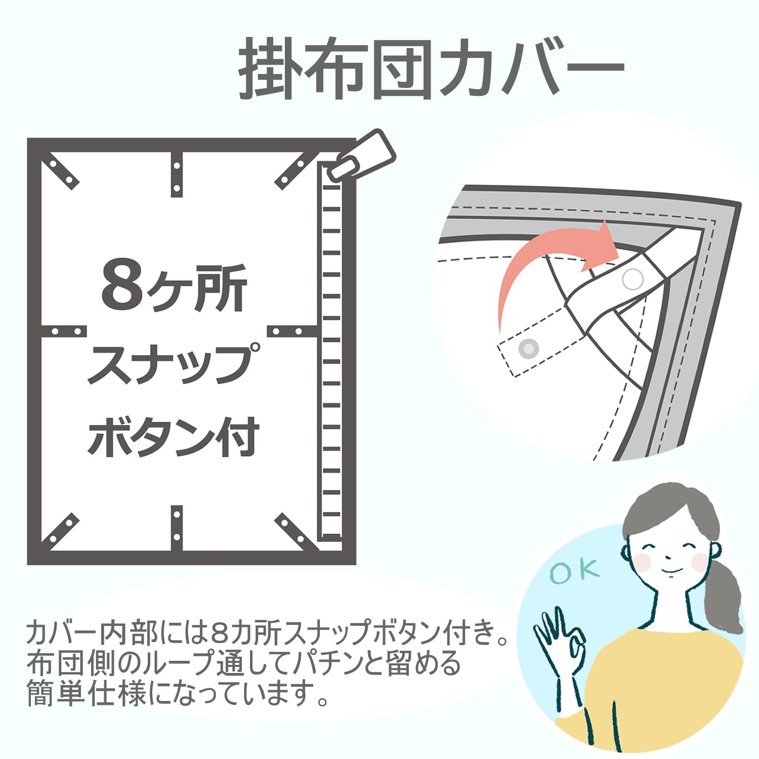 布団とカバーを留める部分は取り外しが簡単なスナップボタン(8カ所)。布団の出し入れがしやすい210cmファスナーを使用。