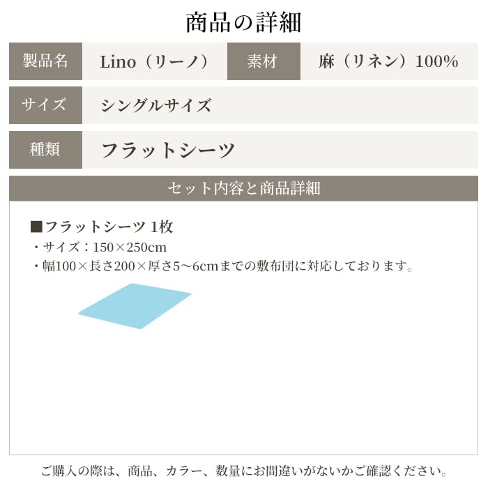 フランス北部やベルギーなどヨーロッパの上質なリネンを使用したカバーリングシリーズ。 国内縫製だから、丈夫で高品質。 「国際規格エコテックス100認証商品」で安心にも配慮しました。 フラットシーツは1枚の布状となっているので、シーツの他、ソファなどにかけたり、ベッドカバーにしたりと、使い方は工夫次第です。 ・ リネンの生地は原料によって色にバラツキがございます。 ・素材の特性上、洗濯により毛羽が落ちますので、洗濯時にはゴミ取りネットなどを使用いただき、単品洗いをお勧めいたします。 ・自然の風合いを保つため、漂白剤・蛍光増白剤のご使用はお避けください。環境問題に考慮して有機塩素化合物(AOX)を生成しない過酸化水素漂白を使用しております。 無塩素加工のため、色合いや風合いに多少個体差がございます。