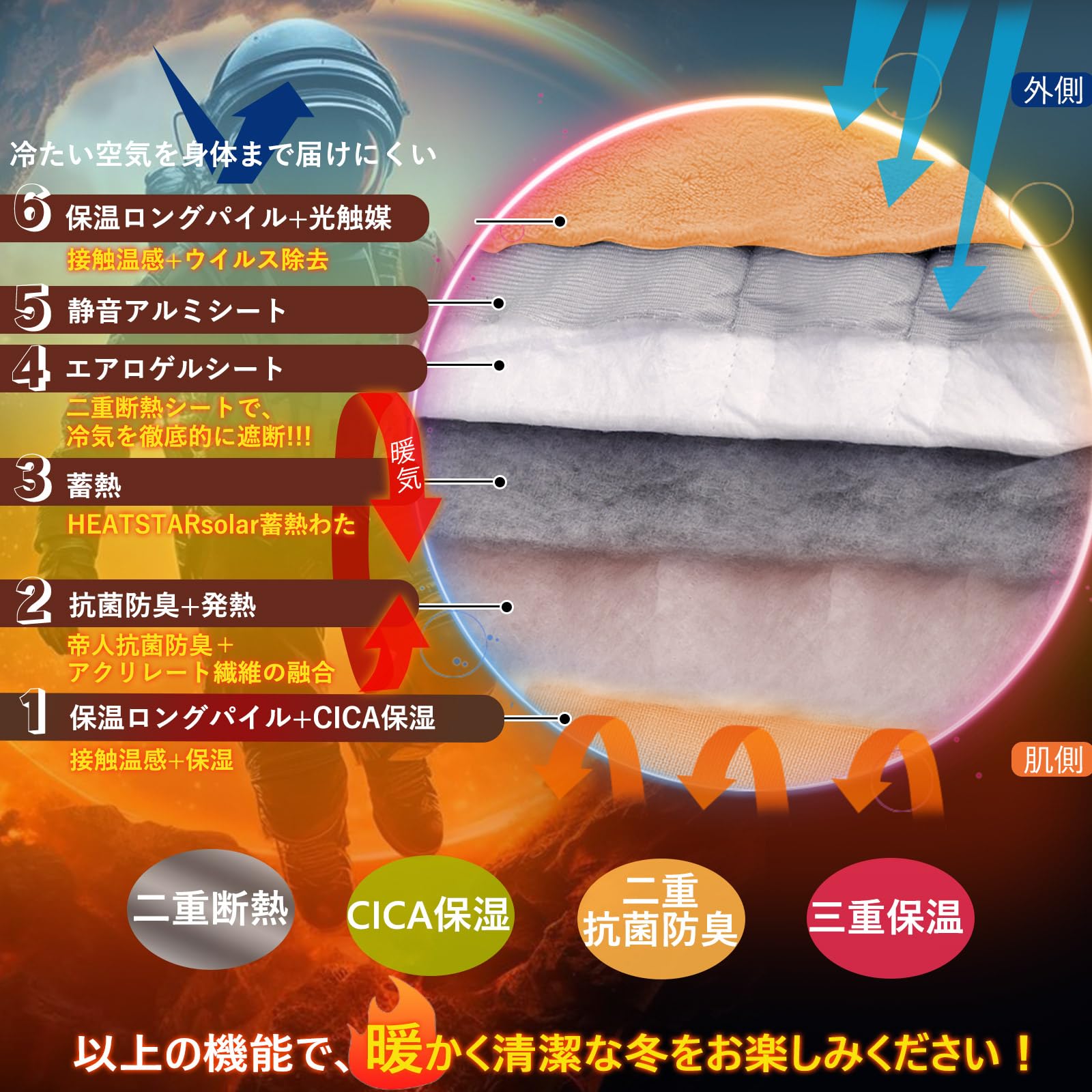 特徴 アルミシート, エアロゲルシート断熱, 吸湿発熱, 帝人抗菌防臭, 抗菌防臭