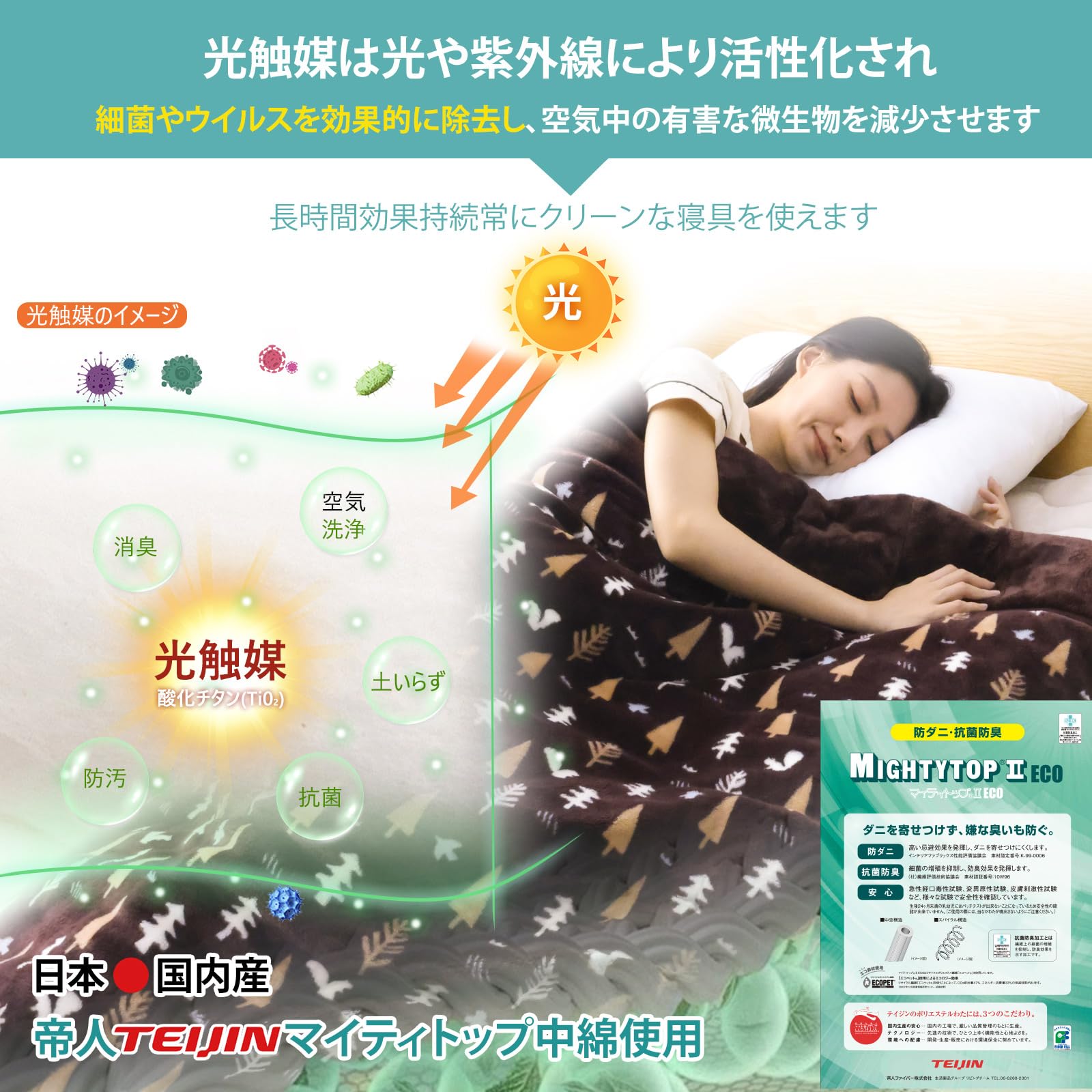 【ダブル抗菌防臭】この毛布には、帝人の「マイティトップⅡECO」抗菌防臭・防ダニ中わたを使って、光触媒加工が施されており、細菌やウイルスの除去、臭い分子の分解を通じて、清潔で快適な環境を保ちます。高い忌避効果でダニの繁殖も防ぎ、小さなお子様にも安心してご利用いただけます。