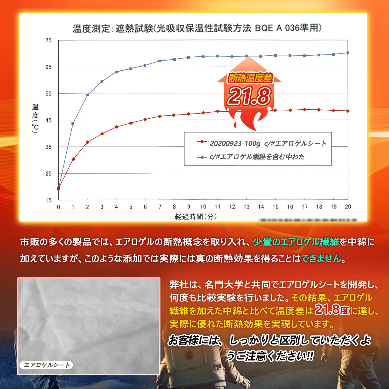 【宇宙服・エアロゲルシート】この毛布が使用している「エアロゲルシート」は、NASAが宇宙空間でも断熱材として採用され、広く知られたシリカエアロゲルをさらに改良し、当社の研究所と有名な大学が研究して、独自加工した特殊生地です、断熱性に優れ、外部からの冷気を遮り、内部の熱を逃がしにくいのは魅力です。