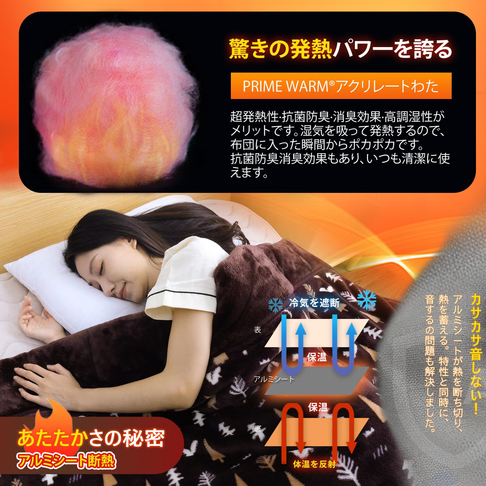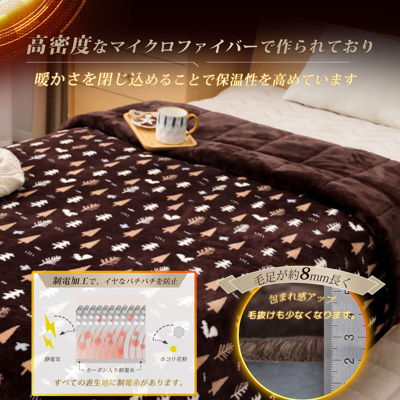 【真冬に絶対】電気代が上昇する今、暖かさ抜群の毛布は冬の快適な必需品です。のこの毛布布団は、アルミシートとエアロゲルシートを使い二重の断熱性に加え、蓄熱綿と吸湿発熱綿を組み合わせた二重の保温性を持っています。また、中綿には日本の有名な帝人の抗菌防臭繊維が含まれ、さらに表面生地には光触媒加工を施したフランネルを使用しており、温感フランネルを使用し、乾燥肌を防ぎながら、肌の修復をサポートし、静電気も抑えるよう工夫しています。