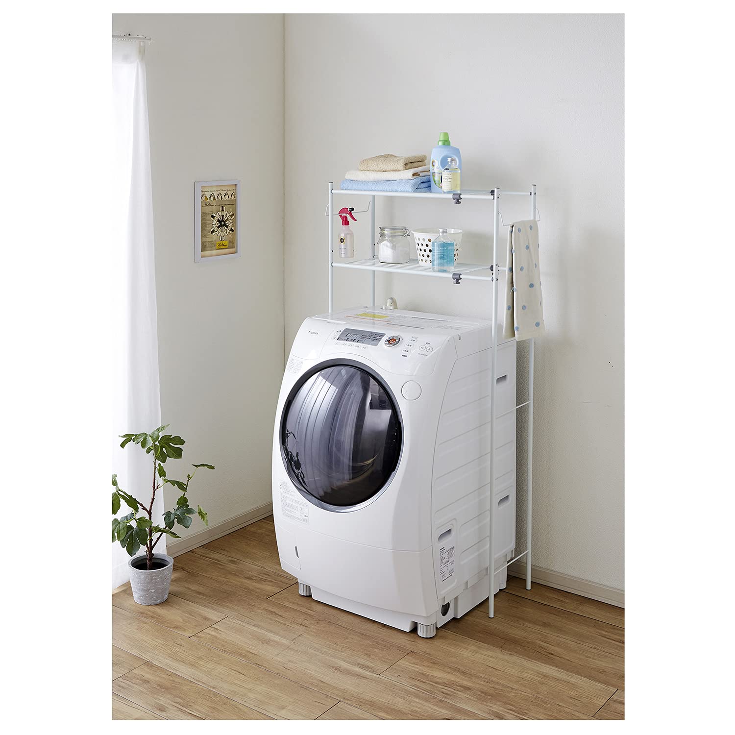 【特徴】伸縮式なので、いろんなサイズの洗濯機に。ハンガーパイプ付き。