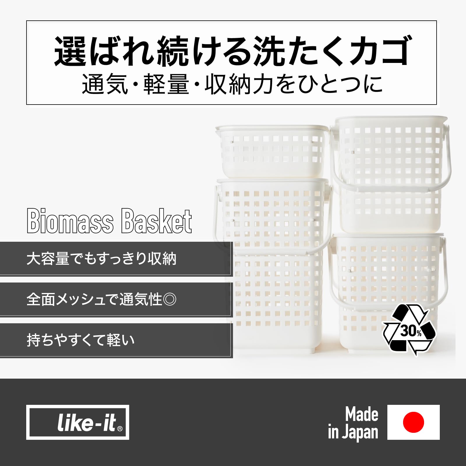 ライクイット (like-it) 洗濯物をスッキリたっぷり収納できる スタッキングランドリーバスケット (L) ホワイト LBB-12C バイオマスプラスチック約30%使用 ランドリー 洗濯 収納