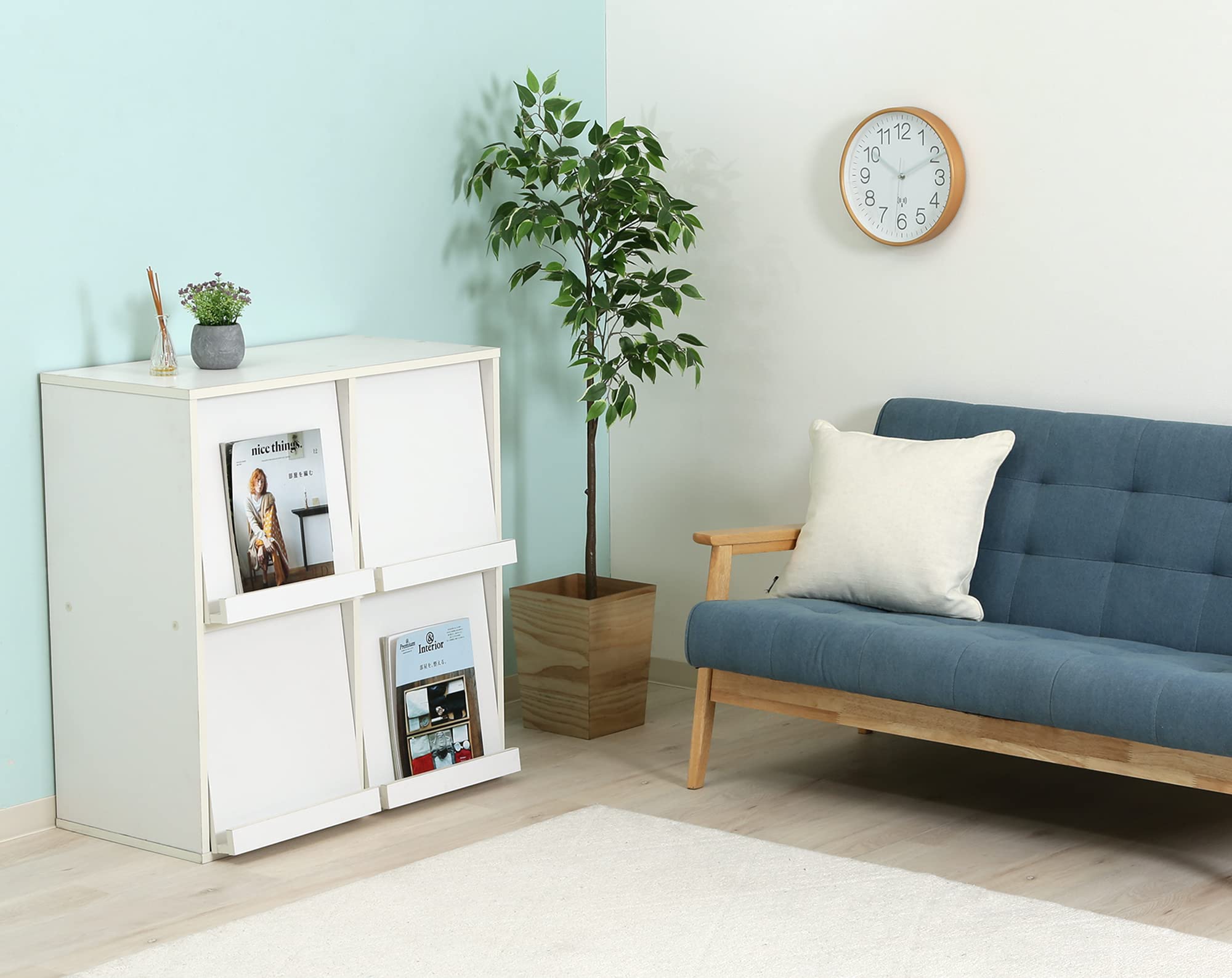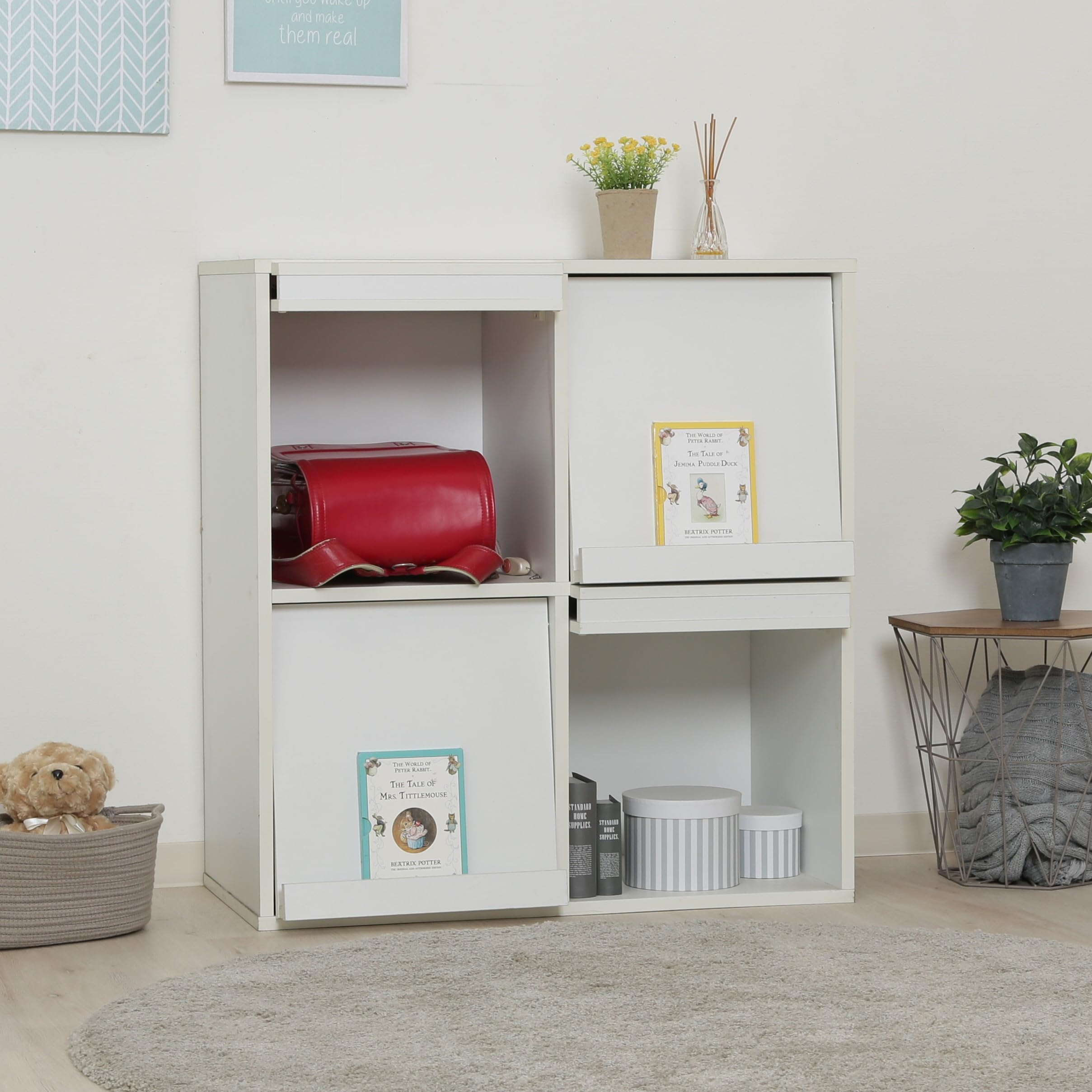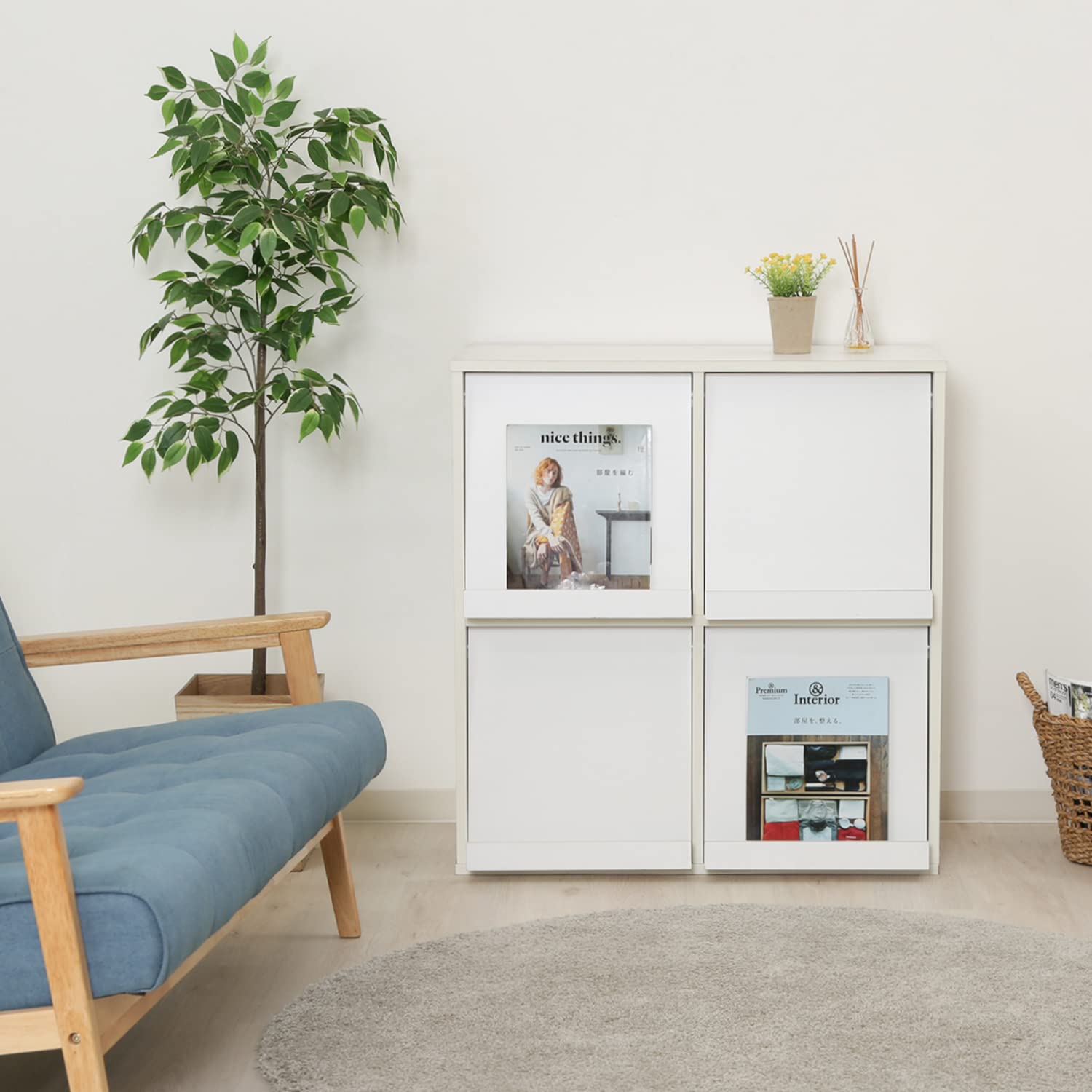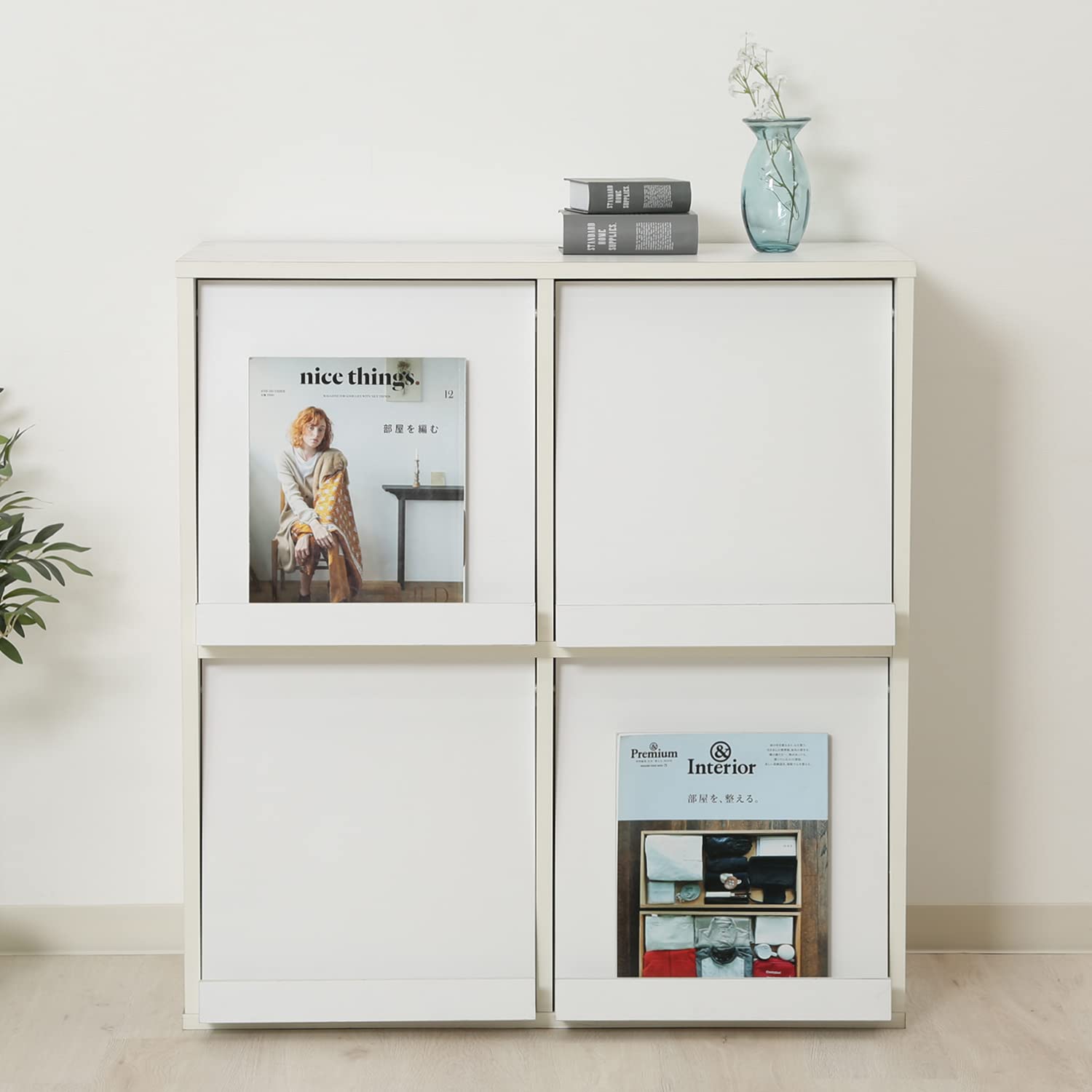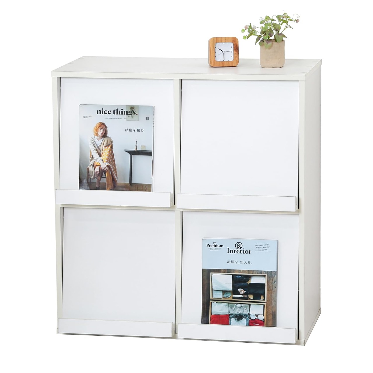 不二貿易 ディスプレイラック 本棚 幅80×奥行46.5×高さ85cm ホワイト 4マス フラップ扉 サイドボード マガジンラック 86034