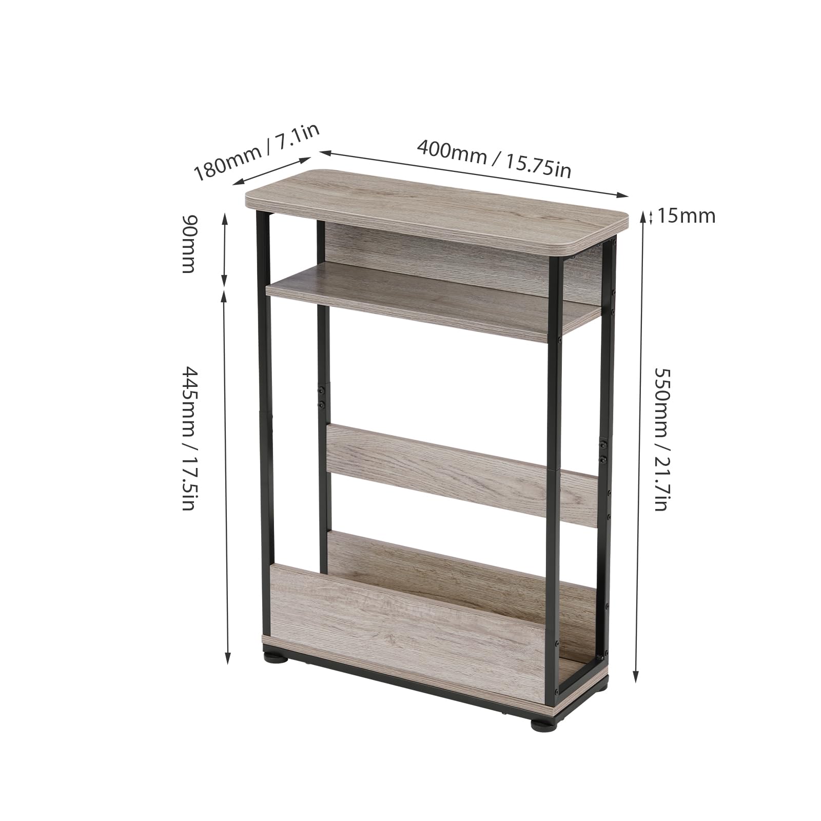 【スリムなサイドテーブル】サイズ:40x18x55cm、重量:約3.5KGです。素材:スチール製 (粉体塗装)+高密度MDF木板。耐荷重:40kg。※日本語組立説明書付き、組立簡単迅速。上下二階に分けて混んでいないので、空間を有効活用できます。雑誌、ハンディブック、新聞などいくつかの大きい物を収納することができます。