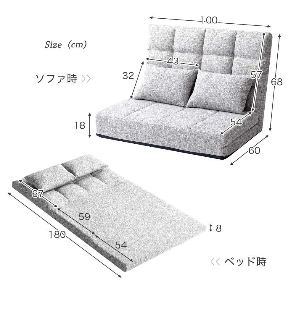 【サイズ】ソファ時:幅100x奥行60x高さ68cm ベッド時:幅100x奥行180x高さ8cm クッション:幅43x高さ32cm 【重量】約13kg