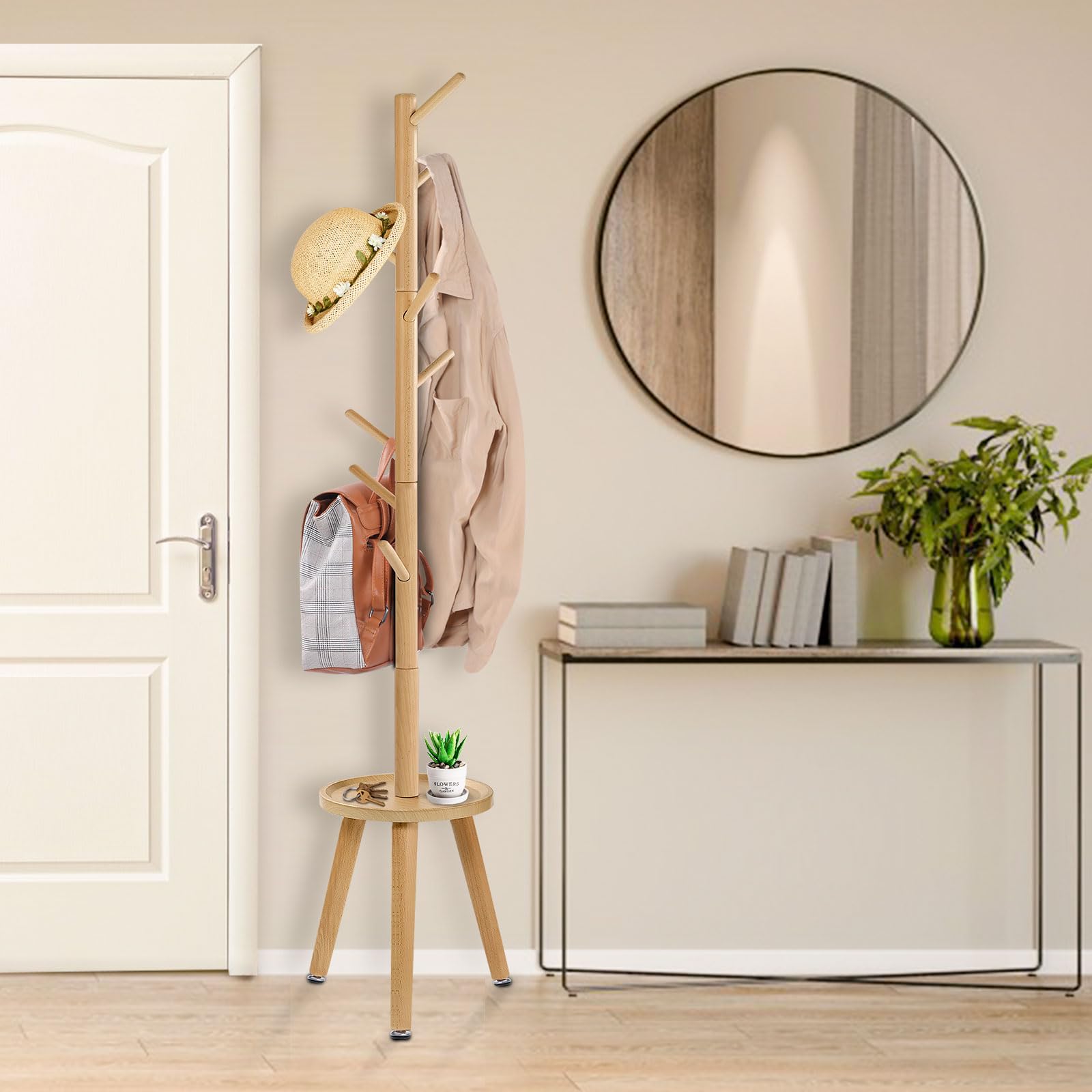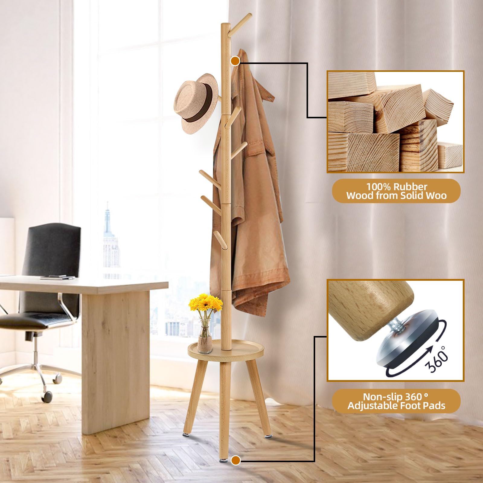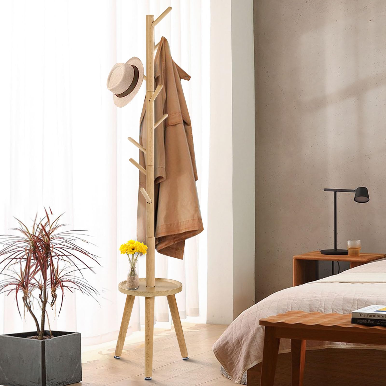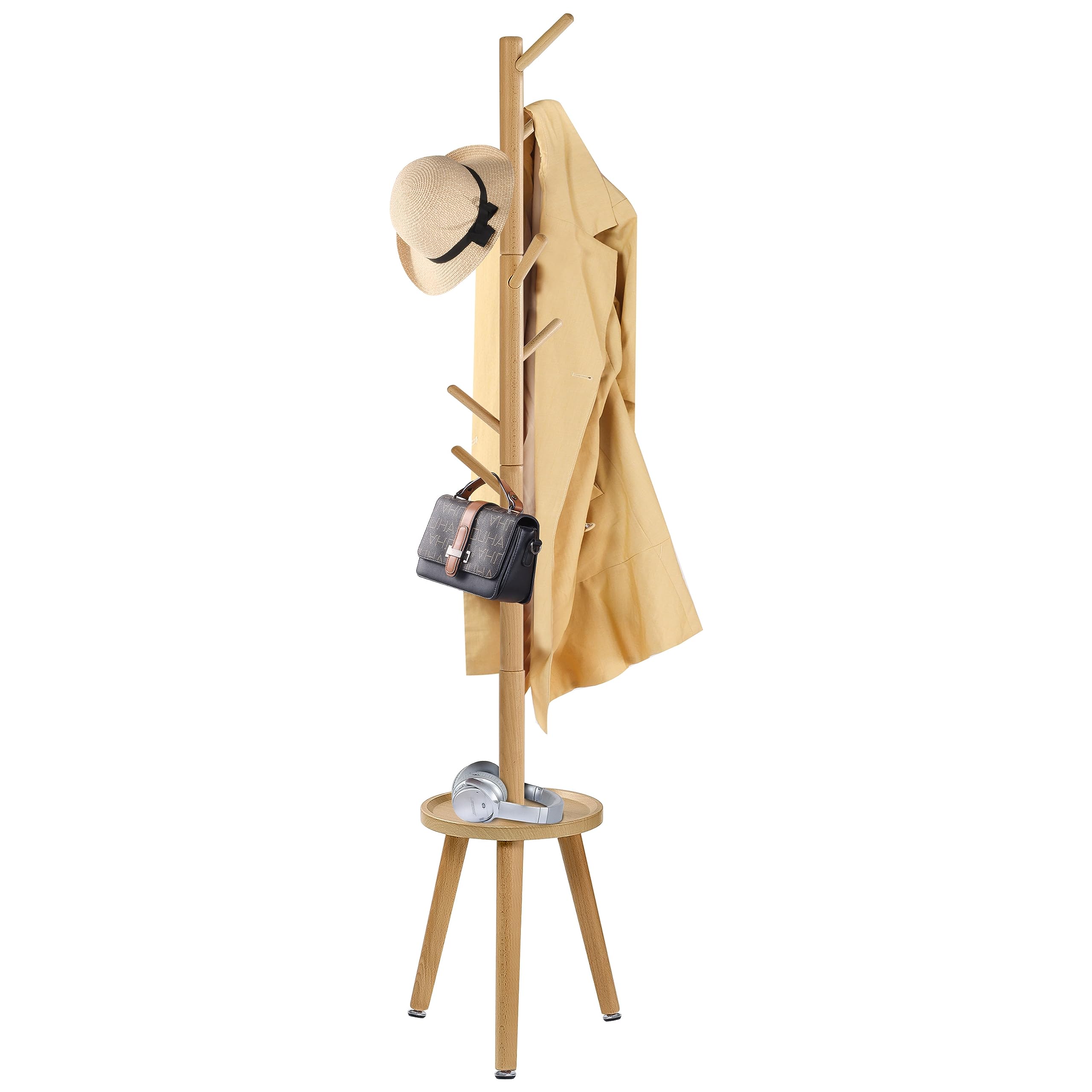 Yawinhe ポールハンガー 木製 コートハンガー コート掛け サイドテーブル付き 8つのフックがついたハンガーラック 3段高さ調節可能 高耐荷重 頑丈 枝型フック設計 倒れにくい 高さ182cm, 組立て簡単 (ウッドカラー)