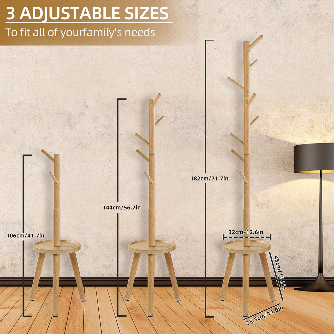 調節可能な高さ:Yawinhe木製コートハンガーは4つのセクションがあり、必要に応じて3段階の高さに調節できます(106cmから182cmの間で調節可能)さまざまな身長のニーズに合わせて。