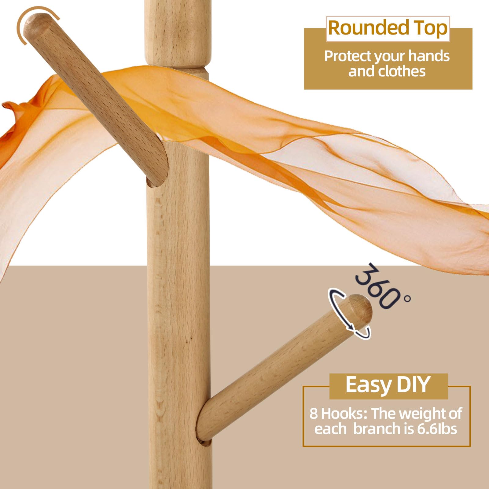 【セール】Yawinhe ポールハンガー 木製 コートハンガー コート掛け サイドテーブル付き 8つのフックがついたハンガーラック 3段高さ調節可能 高耐荷重 頑丈 枝型フック設計 倒れにくい 高さ182cm 組立て簡単 (ウッドカラー)