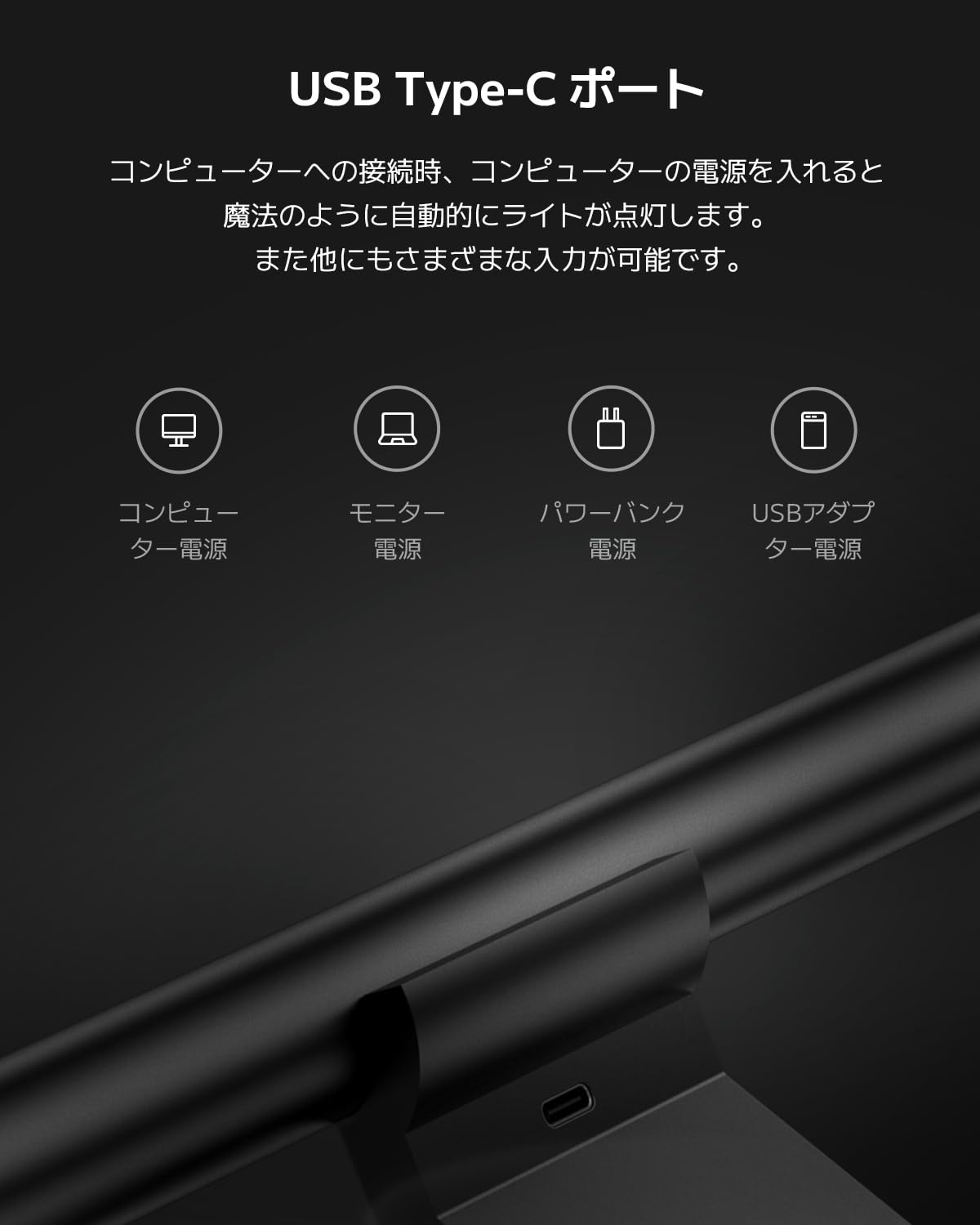 【USB Type-Cポート】コンピューターへの接続時、コンピューターの電源を入れると魔法のように自動的にライトが点灯します。また他にもさまざまな入力が可能です。