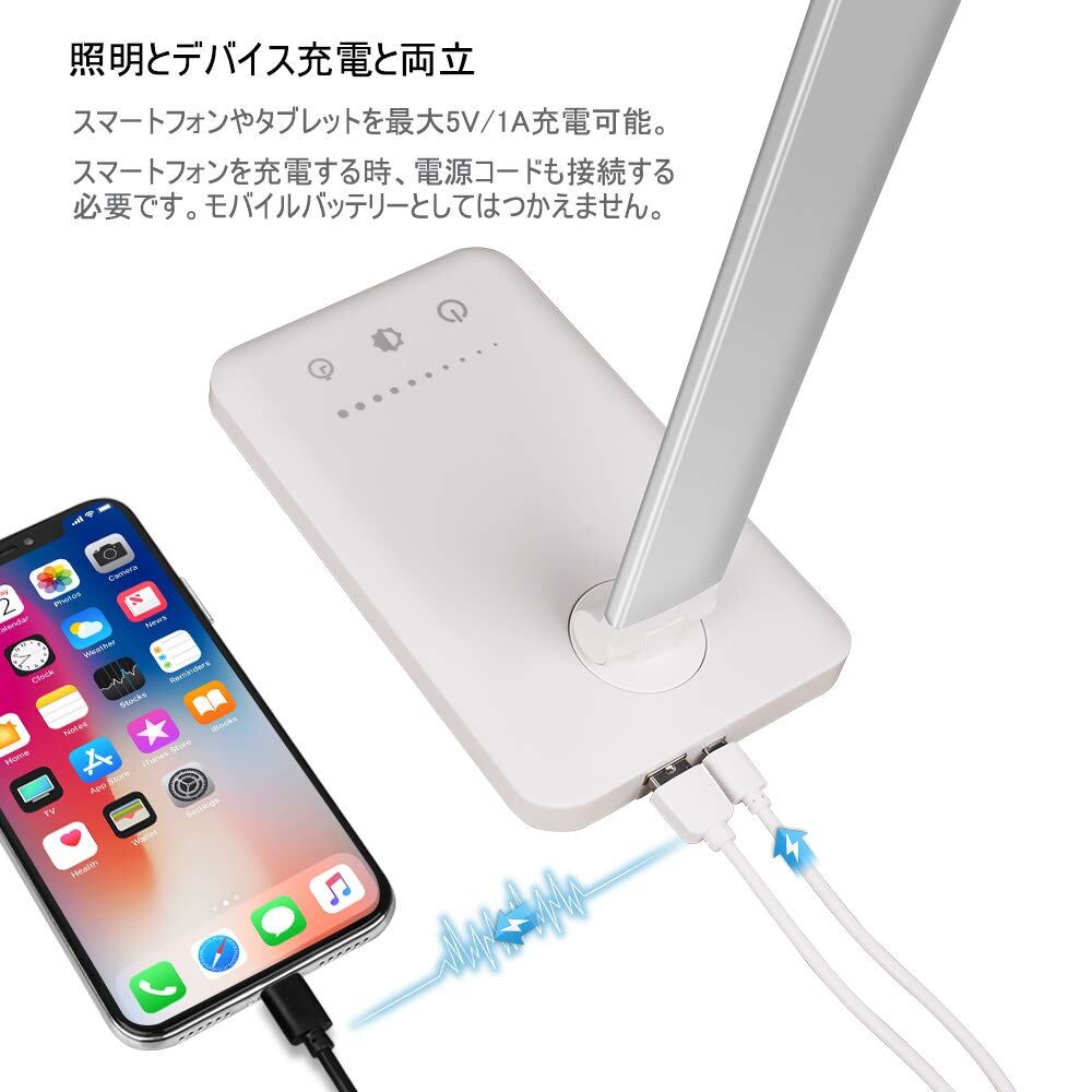 【調整しやすい設計&USBポート付き】アーム部分、ヘッド部分、付け根部分の3ヵ所可動、高い可動性実現でき、使用する時、欲しい照明角度に調整可能です。また、本製品は折り畳み式ですので、調節しやすい、持ち歩きやすい、使わない時もスッキリ収納が可能です。そして、台座の後ろにusbポートを搭載しているため、そのusbポートにケーブルで繋げば、読書しながらスマホなどを充電することができて、かなり便利です。ご注意:電源アダプタはついていません。
