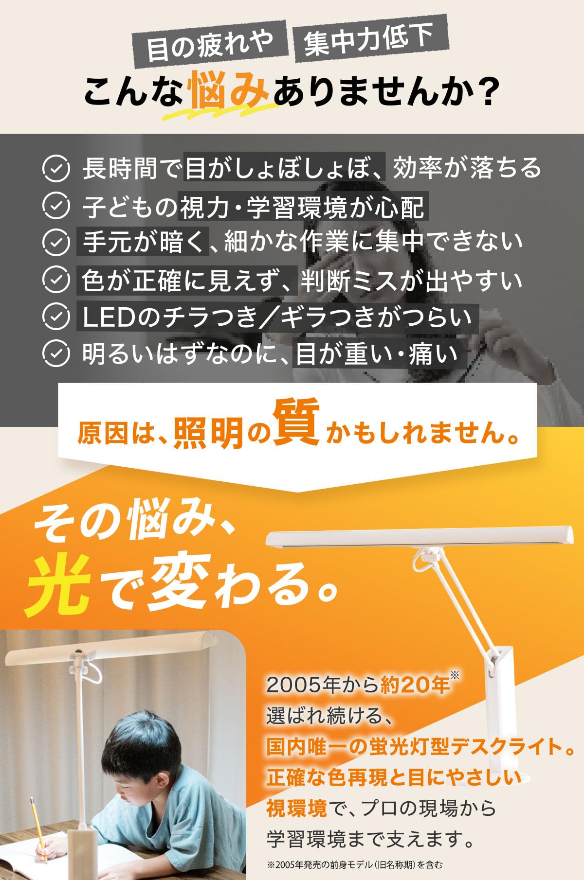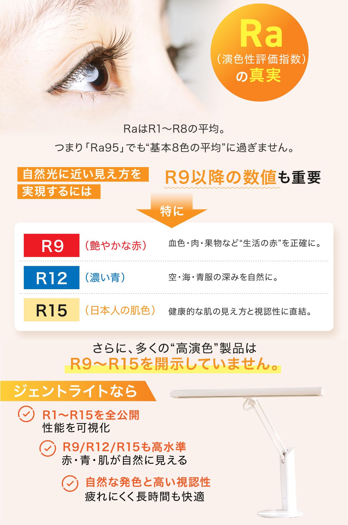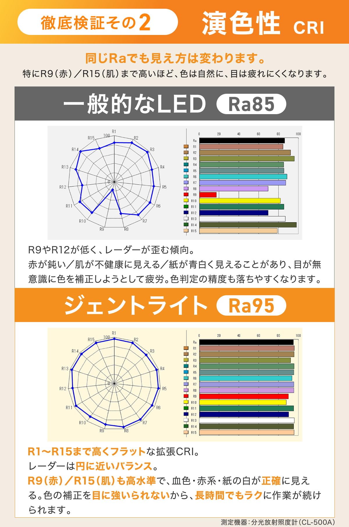 【目に優しい】高演色(Ra95)で色の再現性が高いので、細かな色の違いも分かりやすく、対象物が見えやすく、目が疲れにくい明かりです。