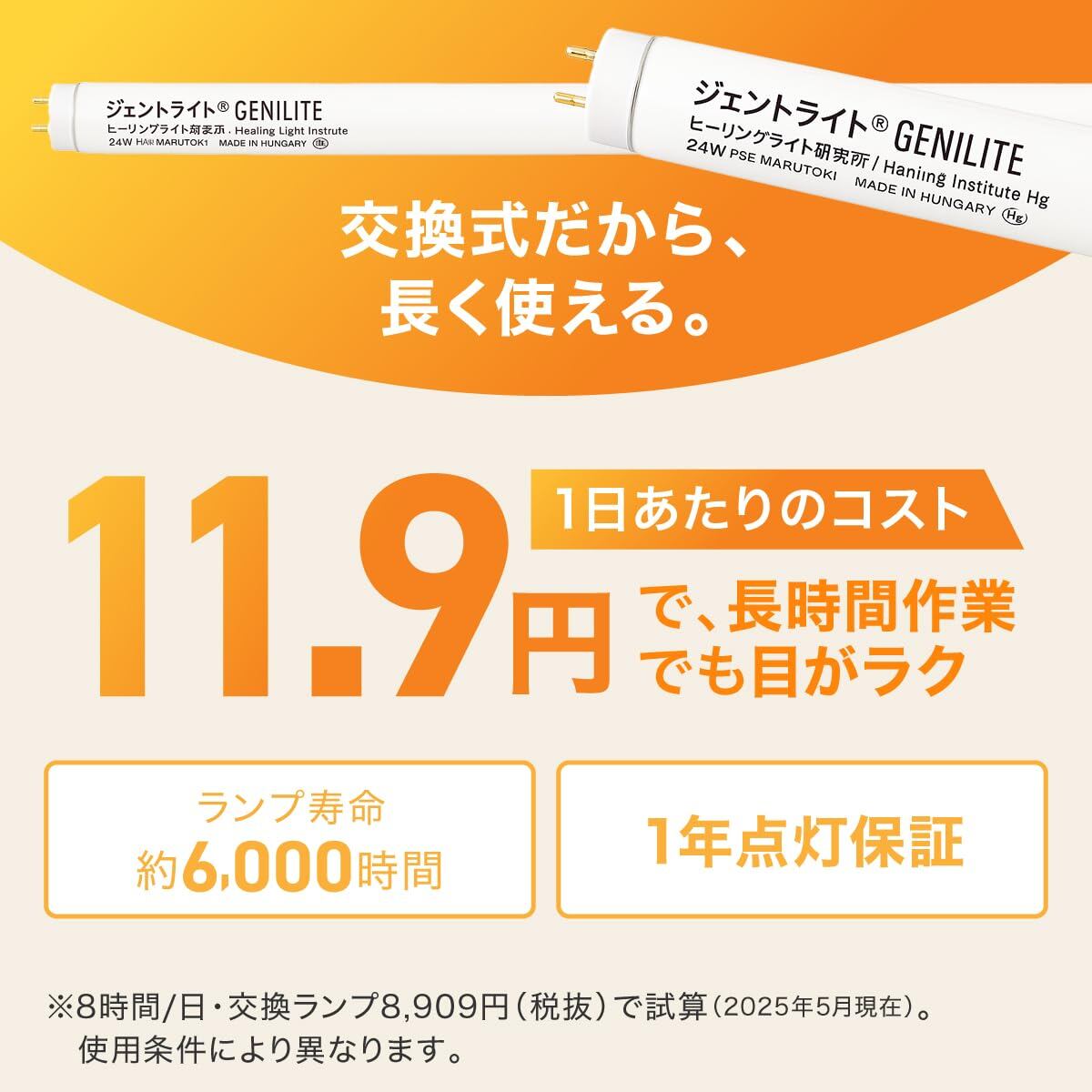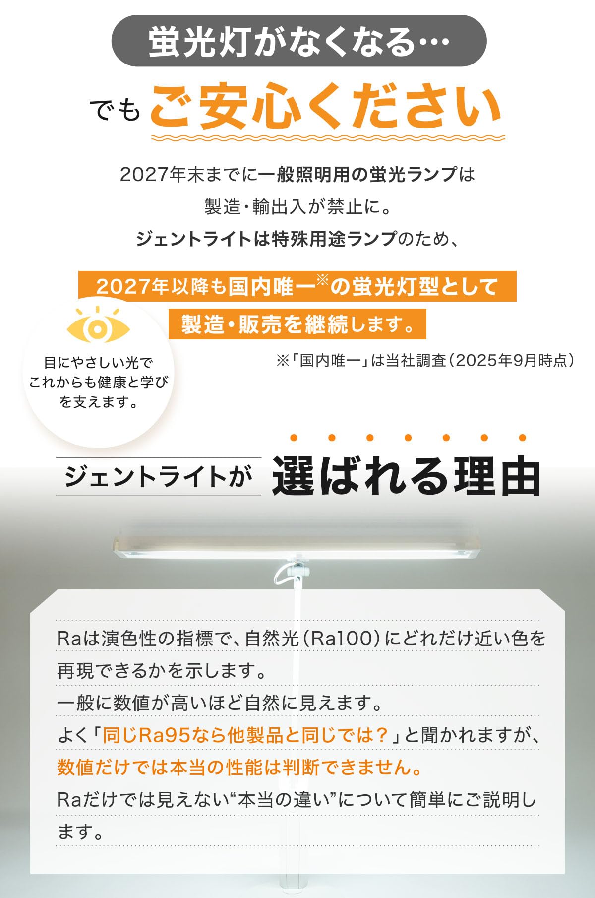 ジェントライトのランプは『一般照明用』ではなく、特殊な波長分布を持つ「特殊用途」の蛍光ランプに分類されています。2023年11月に行われた「水銀に関する水俣条約第5回締約国会議」において、『一般照明用』の蛍光灯の製造と輸出入が2027年末までに段階的に廃止することが決定されましたが、ジェントライトのランプは規制対象外となります。2027年以降も製造・販売を続けて参ります。安心してお買い求め・ご利用下さい。