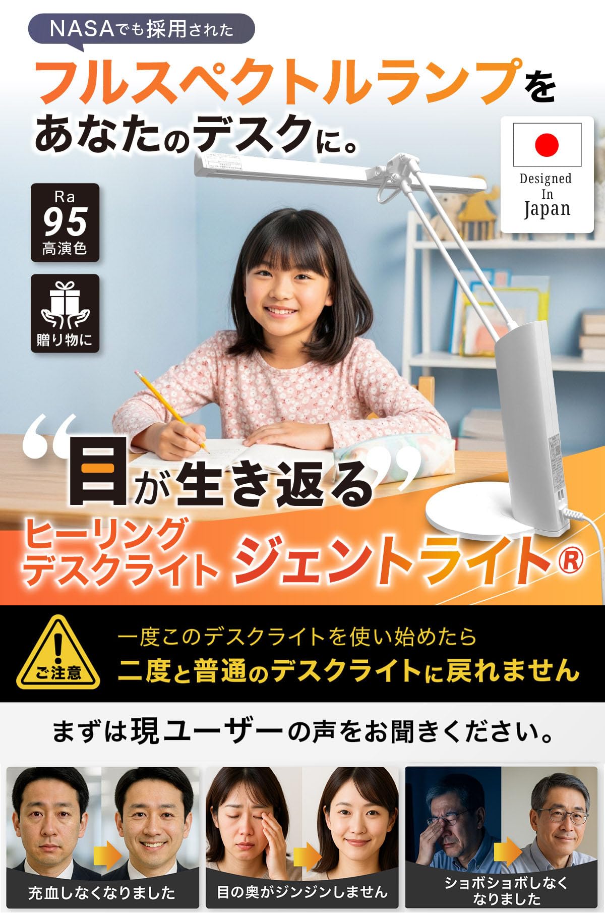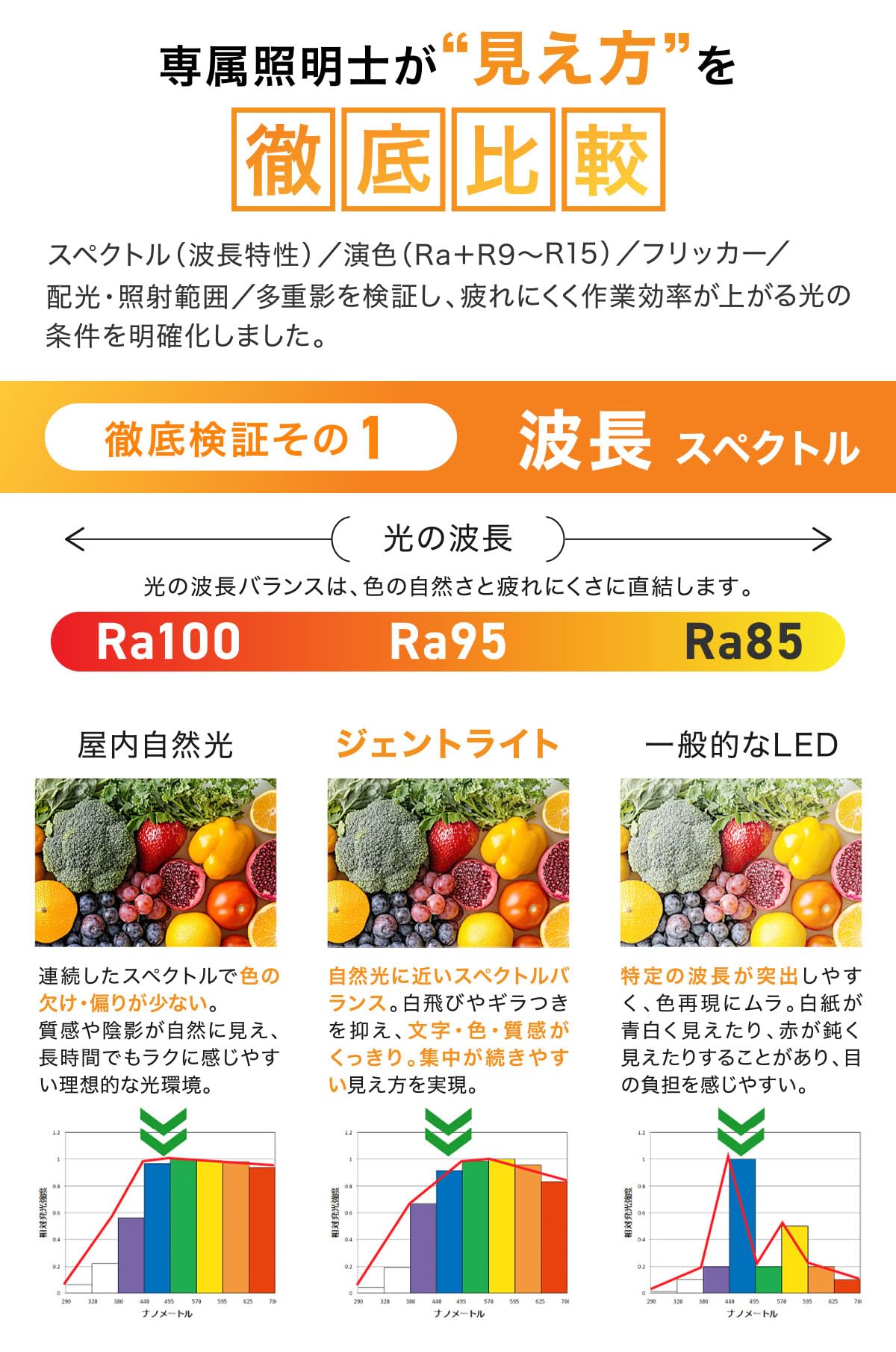 【フルスペクトルランプを使用】ジェントライトは太陽光のように連続的でバランスの良い波長分布の、穏やかで柔らかい光を再現したデスクスタンドです。