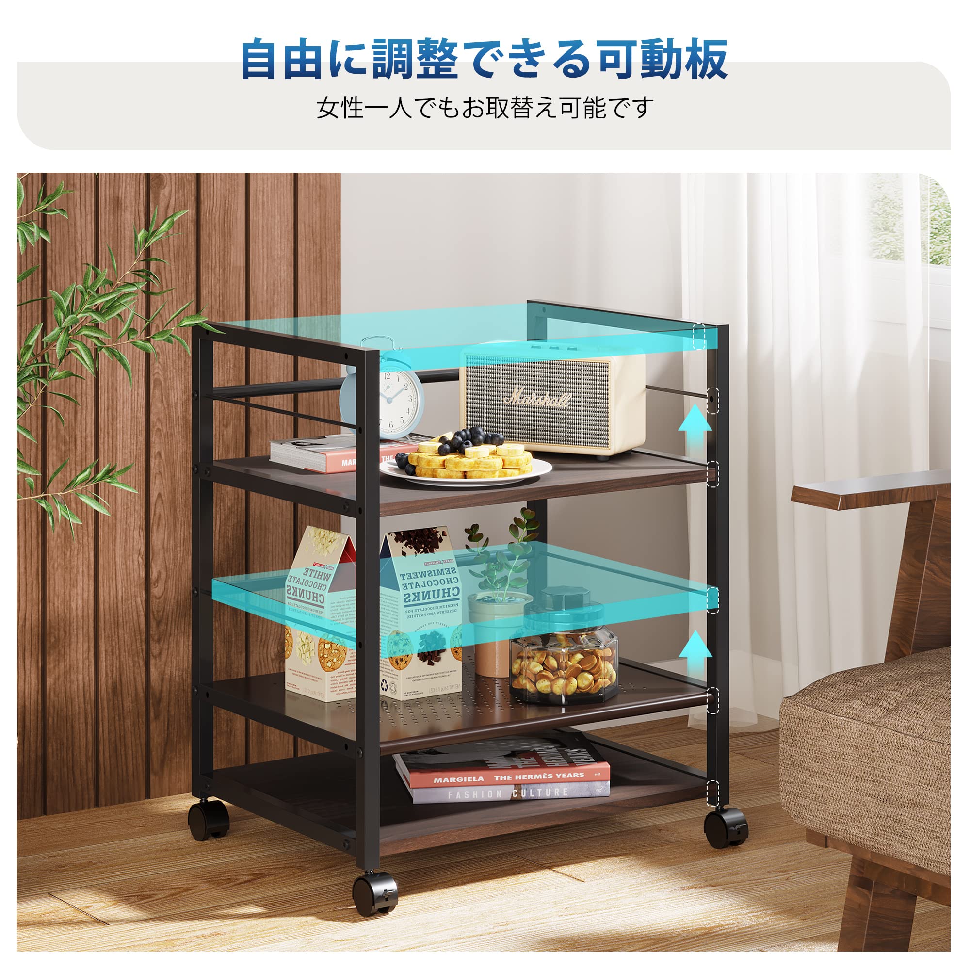 「上下可動棚付き」中棚の位置は3段階の上下調節が可能です。収納する機器や小物のサイズに合わせて変更できます。パソコンラックの両側は落下防止バーが付いて、パソコンの収納や移動でも安心できます。