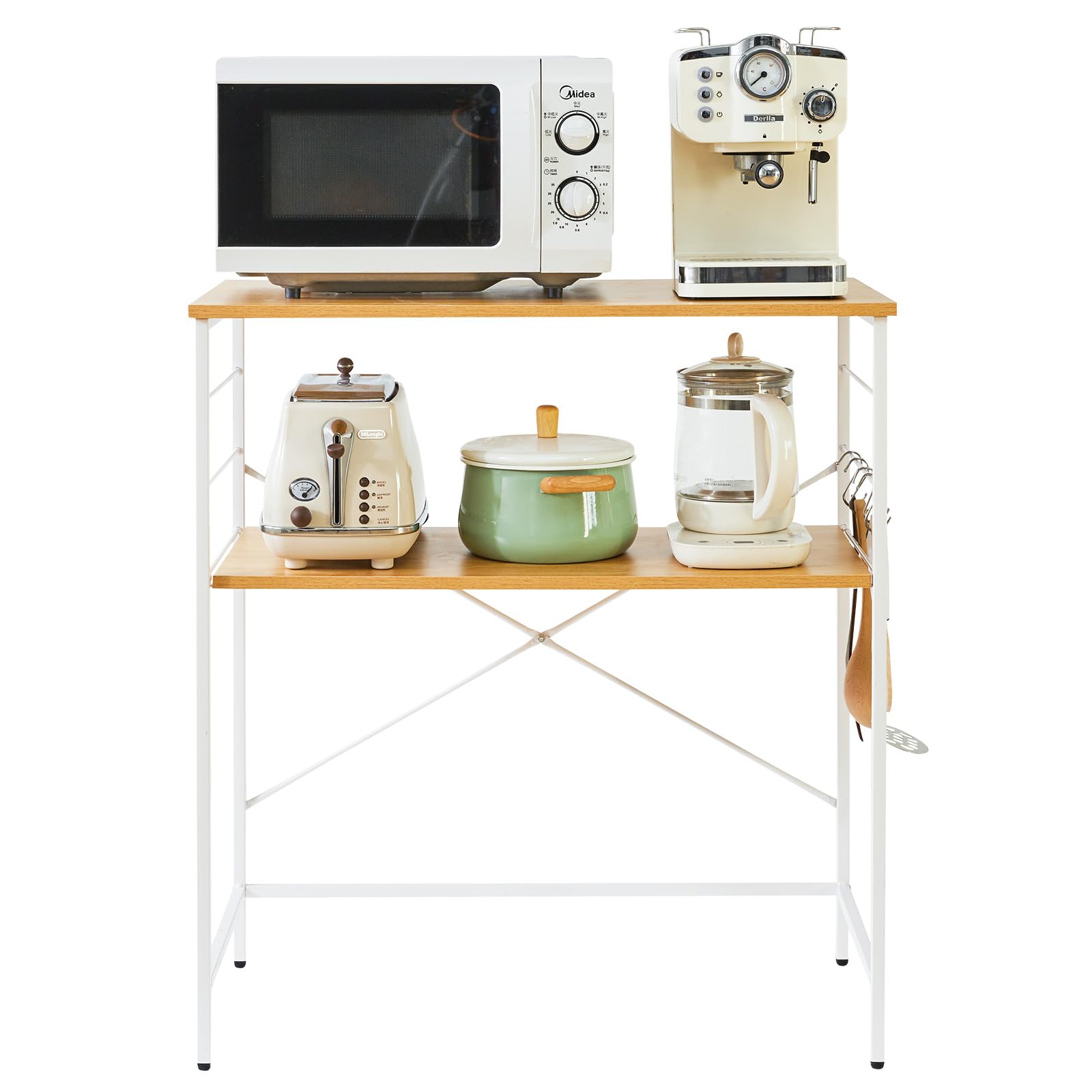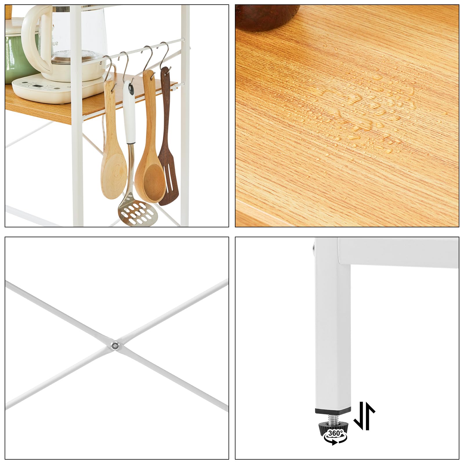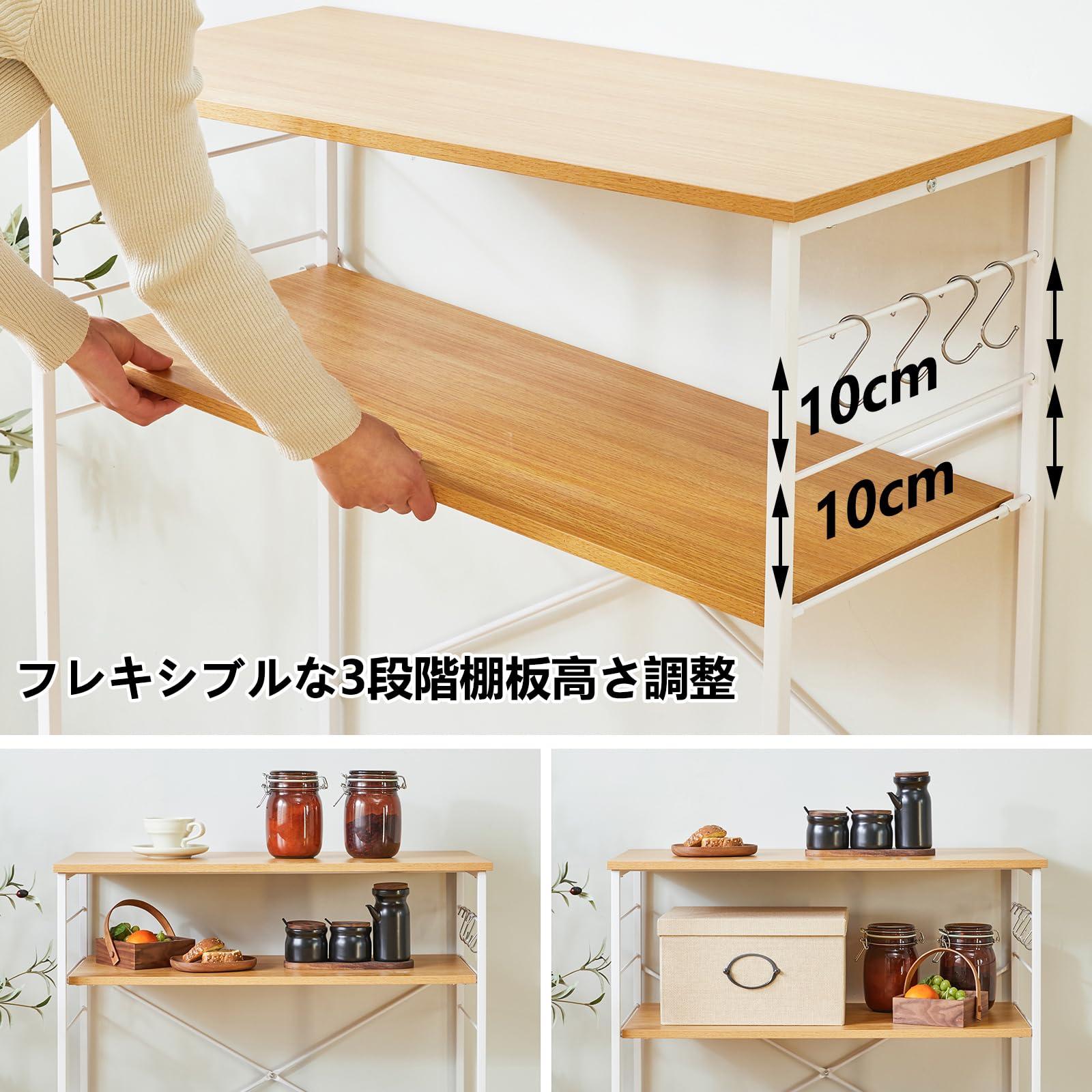 【高さが変えられるリムーバブルラック】このレンジプレートは高さが変えられるリムーバブルラックで、フックに引っ掛けるだけで簡単にラックを動かすことができます。電子レンジ、オーブン、炊飯器、コーヒーなど、さまざまな家電サイズに対応しています。3つの高さは自由に調節でき、工具は不要です。サイズは自由に調節できます。