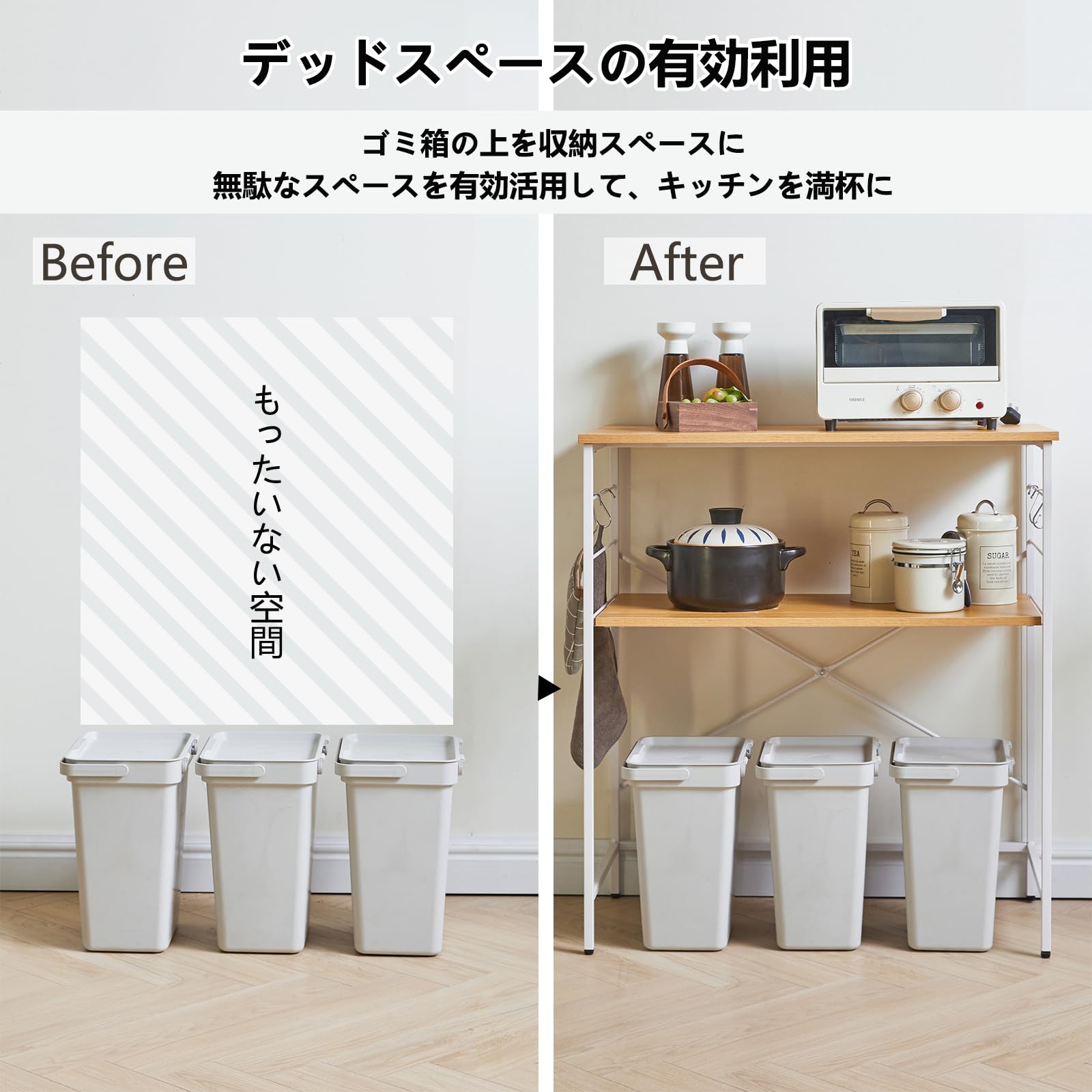 【ゴミ箱上ラック】ごちゃごちゃしたゴミ箱にまだ悩んでいますか?ゴミ箱の上の空間を有効活用 一番下のスペースには、上開きのゴミ箱も置けます。キッチンが片付く多段収納スベース大き目の棚あるので、電子レンジや炊飯器などの電化製品を置くのにとっても便利です、キッチンの整理整頓に悩む必要はありません。