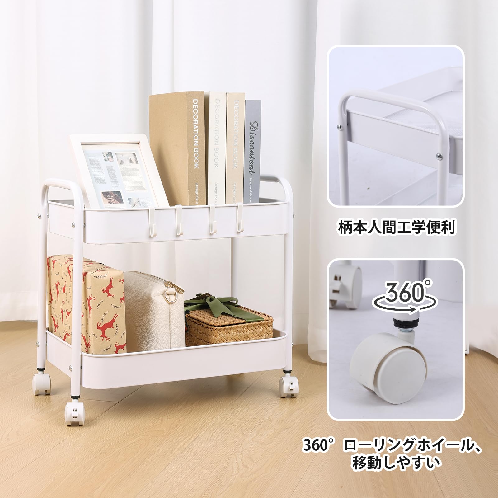 【組み立て簡単】2段ワゴンの組み立ては簡単で、説明書と工具が付属しています。約10分で組み立てられます。2段カートは固定式で、ネジを締めると動きません