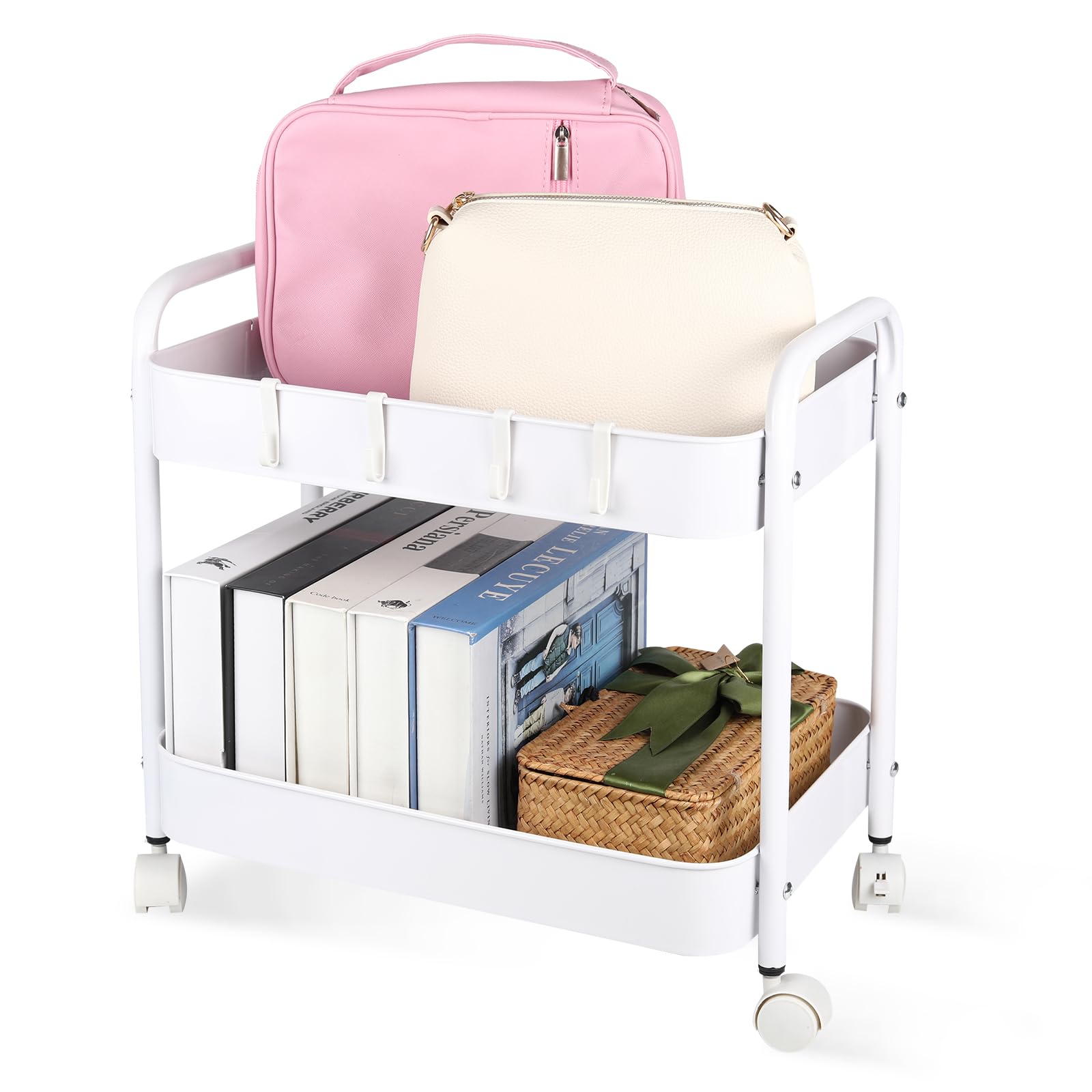 Ufriandzスチールラック小物収納ワゴン2段 デスク下収納 ストッパー付きキャスター キッチンラック全鋼 移動に便利 寝室、オフィス、ランドリー、狭いスペース,白