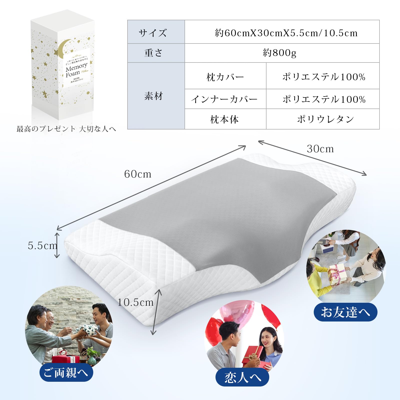 【どんな寝姿勢でも快適】中央のくぼみと両側のカーブが頭・首・肩をしっかり支え、仰向けも横向きも楽な姿勢を保ちます。