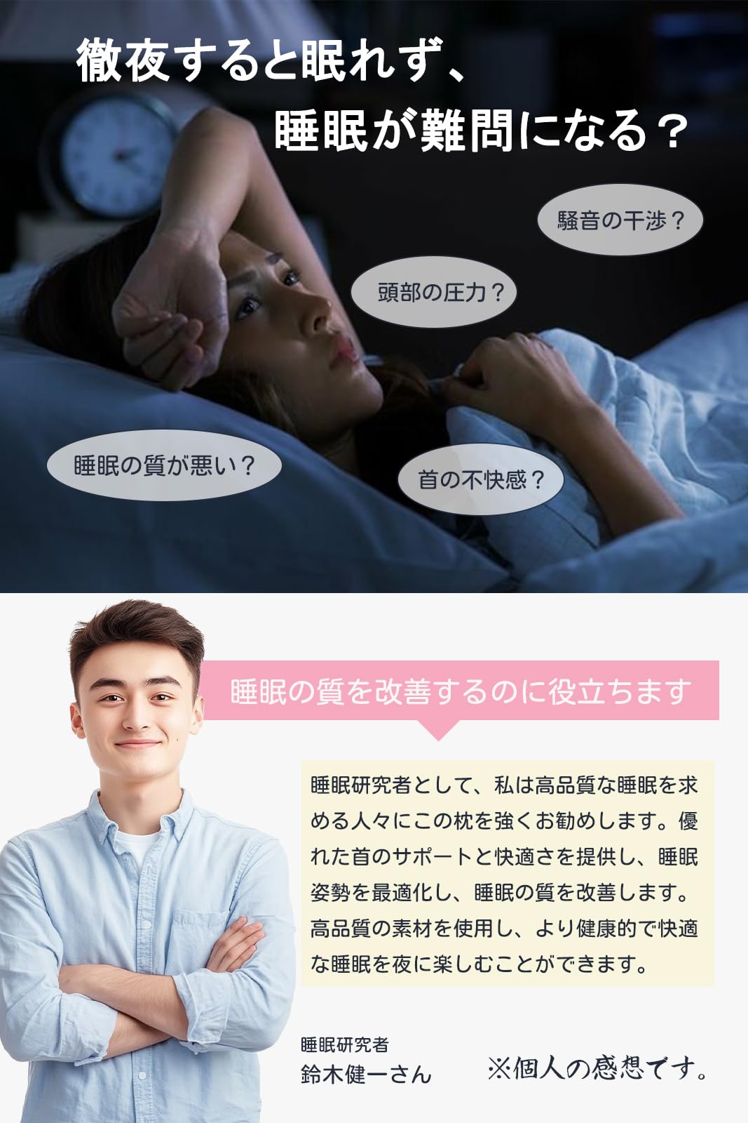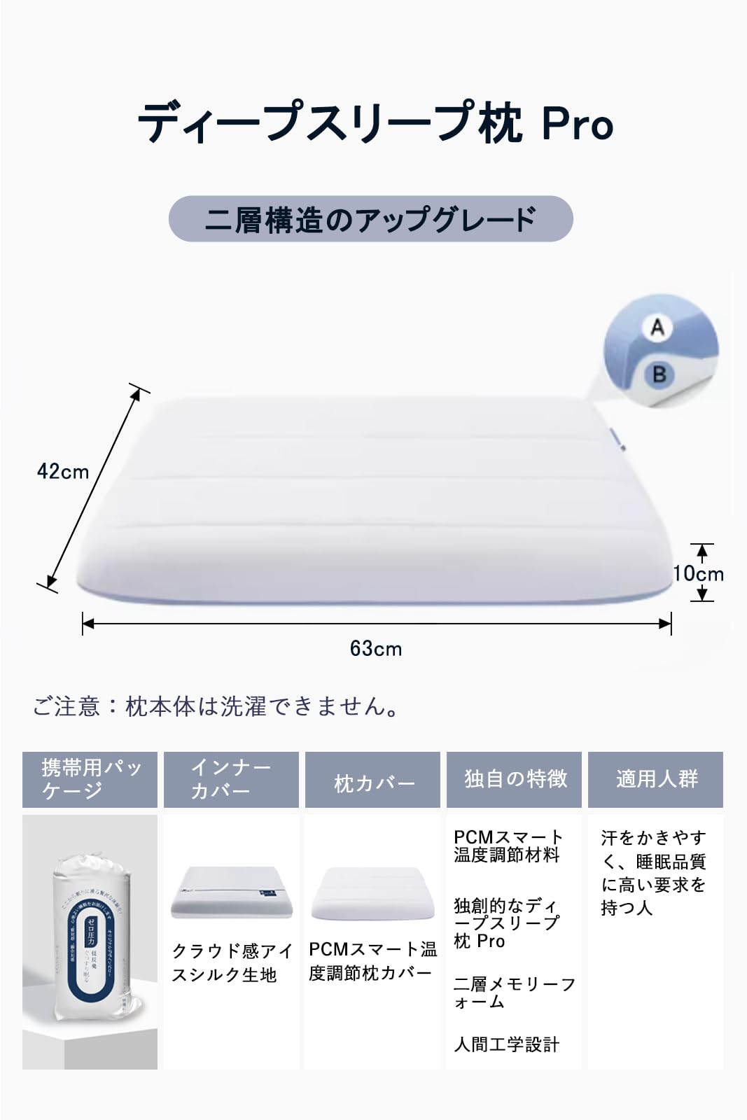 【理想的な寝心地を追求した2層構造】この枕は、2層構造により、柔軟さとサポート力を兼ね備え、個々の体型にぴったりフィットします。体圧を分散し、首や肩への負担を軽減。理想的な寝心地を実現します。