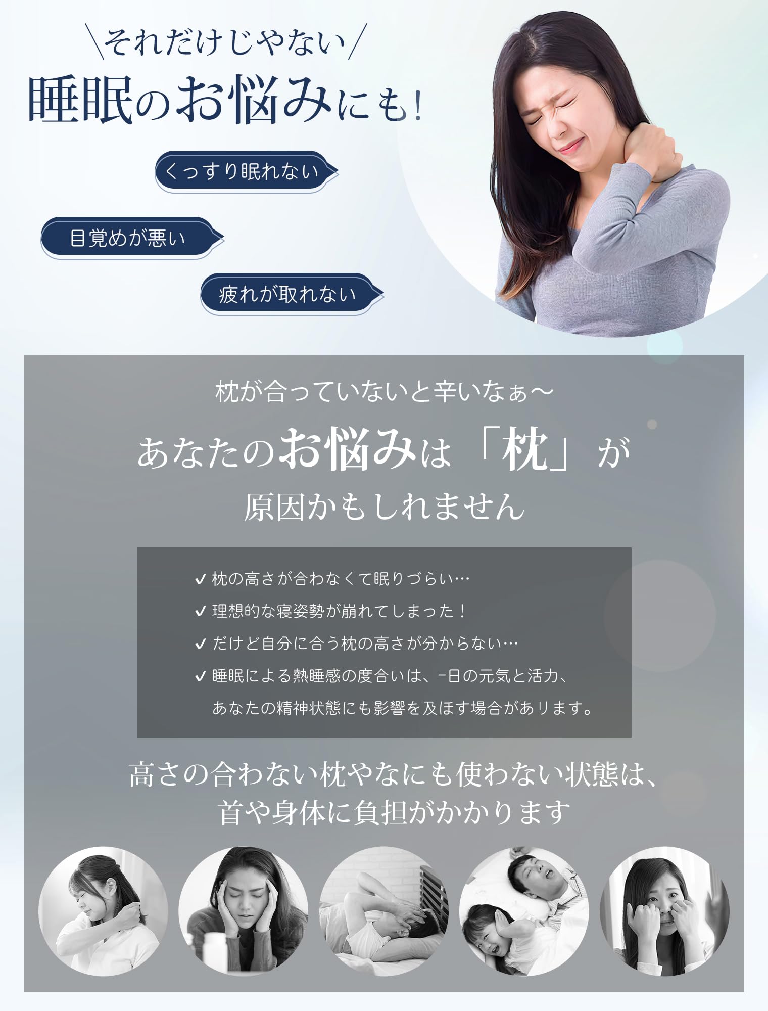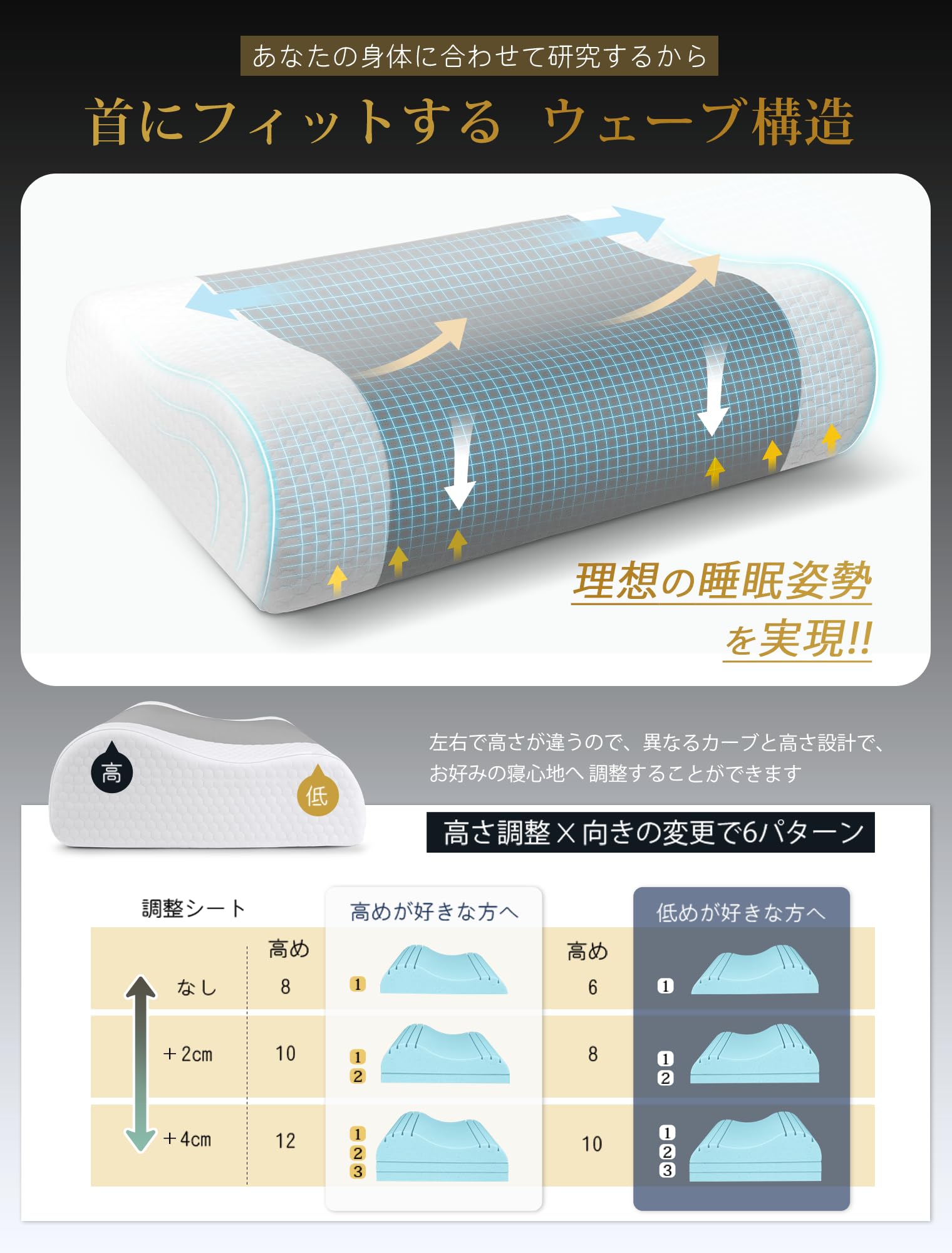 ???♀?【枕難民から解放される新感覚枕、睡眠の質向上へ】頭の形や頸椎のカーブは人それぞれ違うため、理想な寝心地のために開発した枕です。高さと頸椎を支えるカーブが違う両側仕様(低め側6㎝と高め側8㎝)となっており、下層に2cm×2枚の調整パッド付きだから6cm~12cmまで、オーダーメイド感覚でお好みの高さをきめ細やかに調整できます。低め側は低めの枕がお好みの方や仰向け寝が多い方、小柄な女性やお子様にオススメ、高め側は高めの枕がお好みの方や横向き寝が多い方、大柄な男性にオススメです。ご自宅の睡眠環境を考慮しながらきめ細かく設計されています。一人でも多くの方に快適な眠りを楽しんでいただきたい。