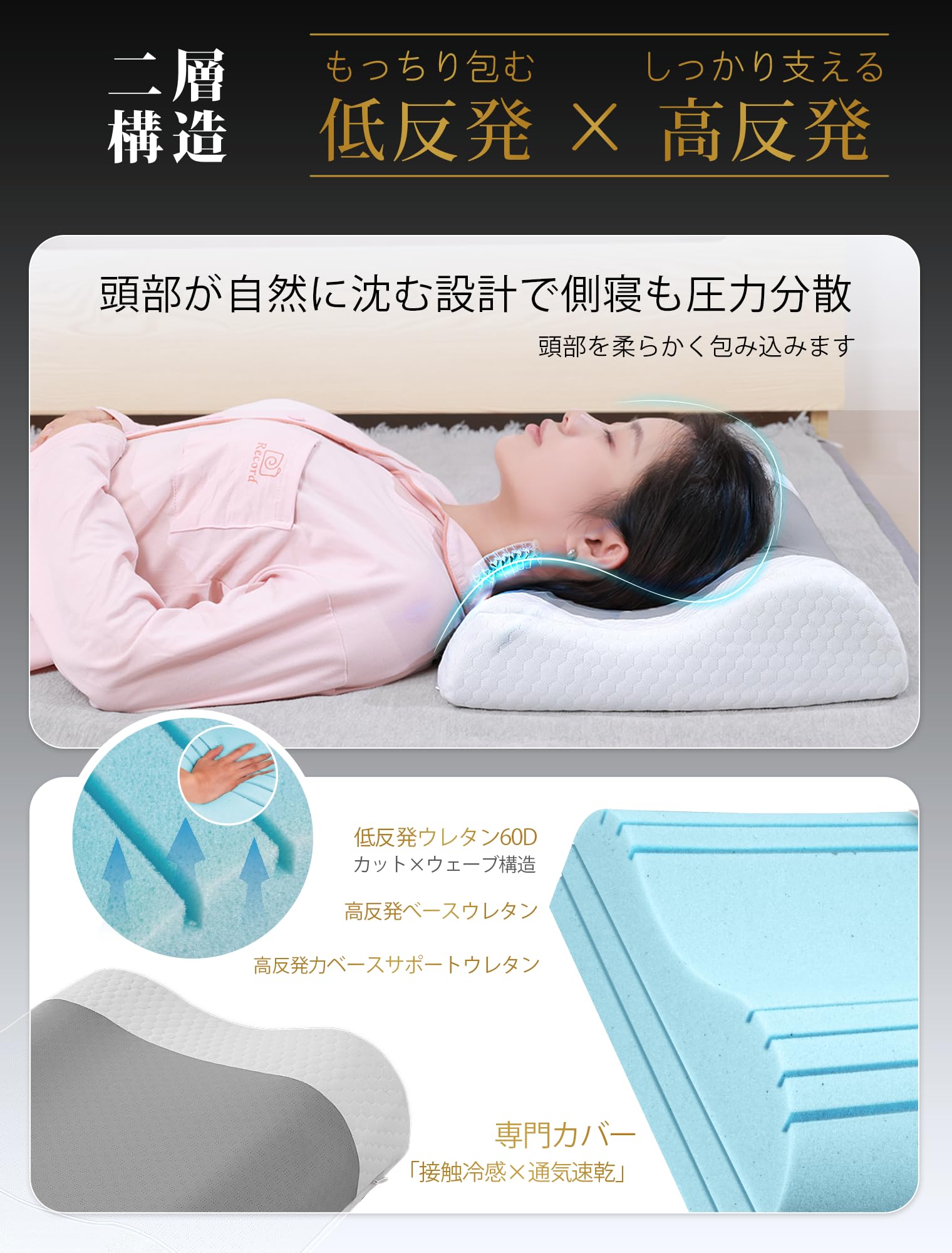 ??【安眠の新基準?次世代枕が睡眠体験を進化させる】抜群なフィットする低反発と首元をしっかりと支える高反発を両立させ、上層、中層と下層で密度違うウレタンの3層構造になっており、支えながら優しく沈んで、首や頭部をしっかり支えて体の負担を軽減、快適な寝姿勢を実現します。寝返りを打っても枕からずれ滑りにくく、就寝時の安心感が向上します。耳は圧迫感を感じにくく、骨もまっすぐになるように体にフィットします。支えの柔らかさと硬さは絶妙なバランスで、首の疲労を緩和することができます。