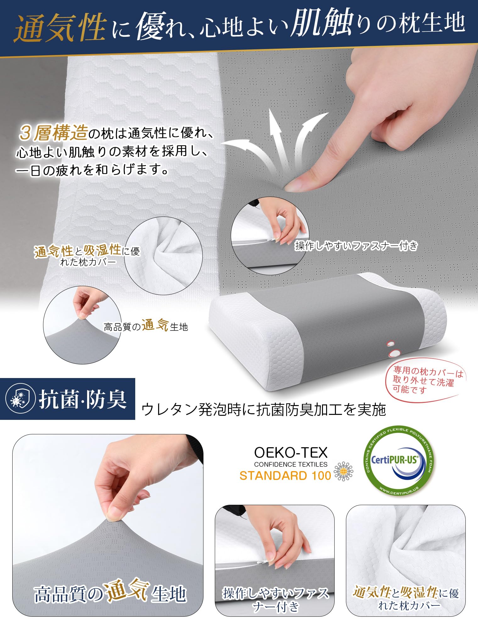 ??【接触冷感の専用枕カバー、朝まで快適サポート】【接触冷感の専用枕カバー、朝まで快適サポート】極上の肌触りの専属カバーのQ-max値は0.324(※実験条件:室温20℃・相対湿度65%)一般的な枕カバーと比べ、約62%も冷たさを実感できます。暑さで眠れない夜にも、頭や首元を即冷却!抗菌防臭加工で臭いの発生も抑えます。洗濯できるので清潔にお使いいただけます。また、インナーカバー(取り外し不可)は詰め物への汚れの染み込みを防止します。夏の暑い季節も、冬の寒い季節も、 頭部にはスッキリと涼しく爽やかな寝環境が推奨されています。(製品到着時にはカバー内に内蔵されています。)CertiPUR-US認定とSTANDARD 100 by Oeko-Texの認証を取得済。