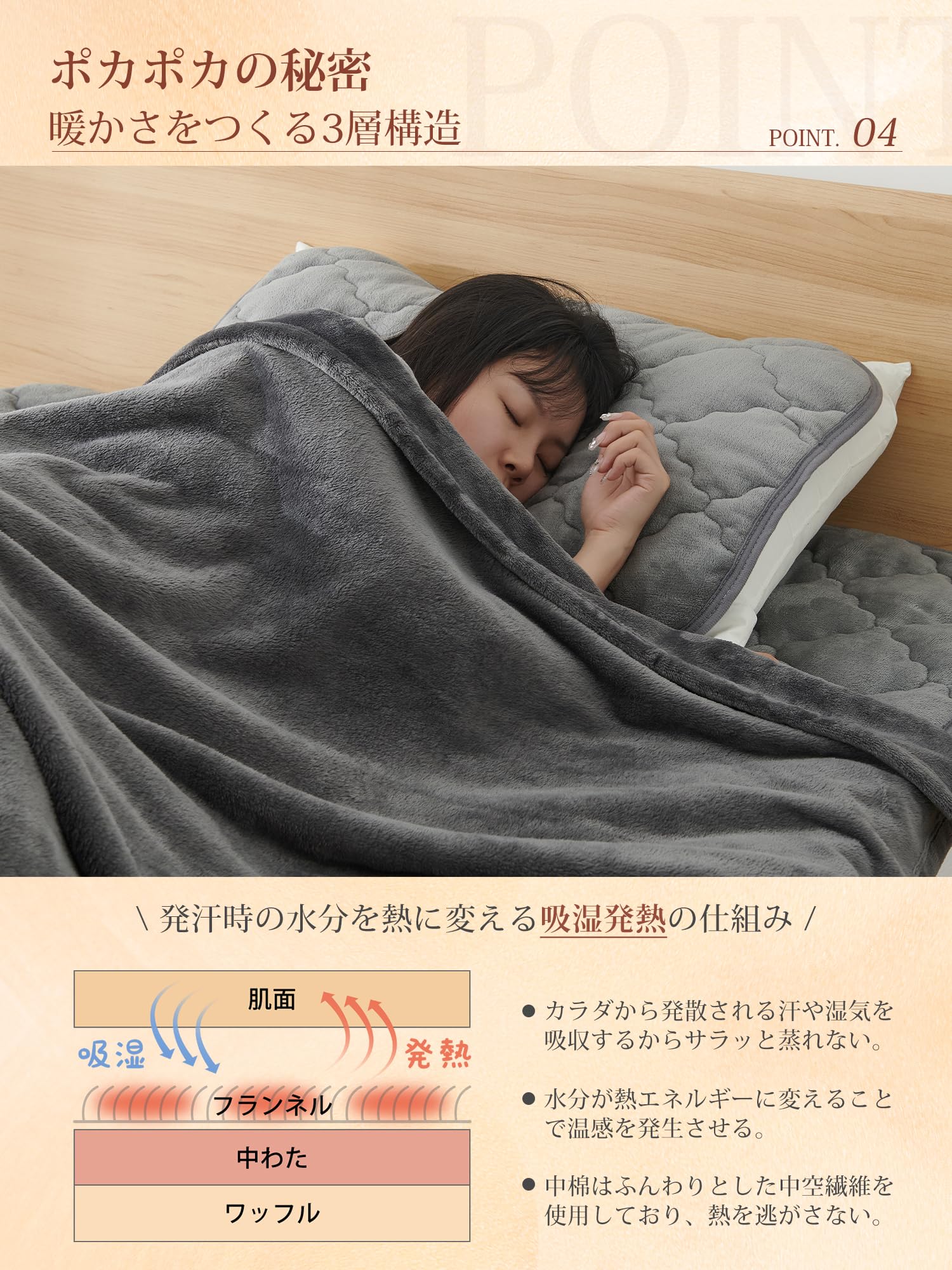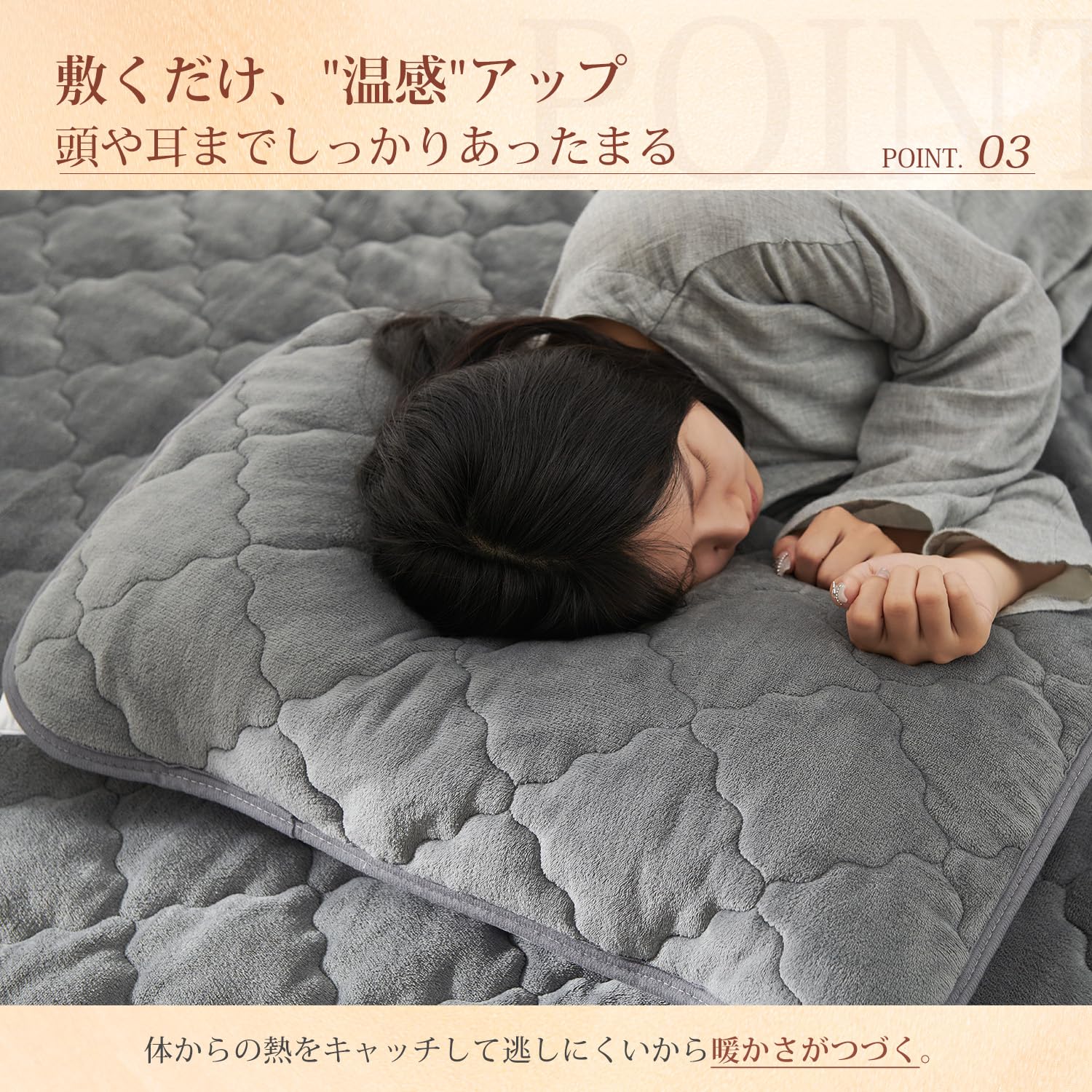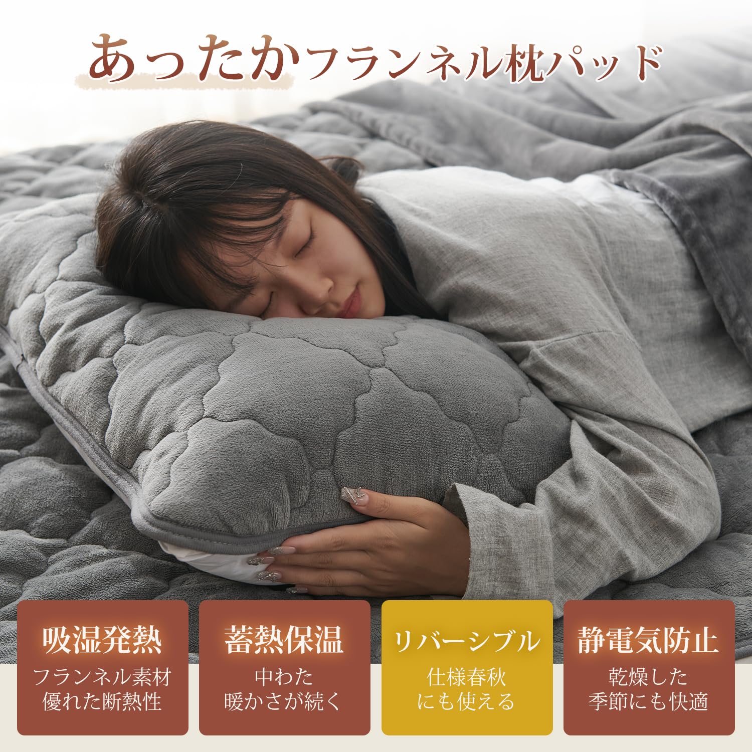 「持続温感枕パッド」フランネル面は柔らかく、厳冬でも頭に触れた瞬間にひんやりしません。マイクロファイバーを使用しているため、細かい繊維の間に空気を取り込み、暖かい空気を逃がさずに保ちます。さらに、蓄熱わたは体から発生する湿気を熱に変え、持続的な暖かさを実現します。