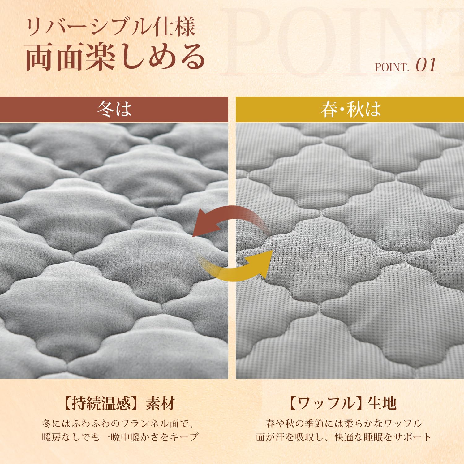 「リバーシブルで両面楽しめる」肌寒い時には柔らかくて暖かいフランネル面を、暑さや湿気を感じた時にはワッフル面を使えます。気候や気分に合わせて、表と裏を使い分けることで、1枚で快適に過ごせます!