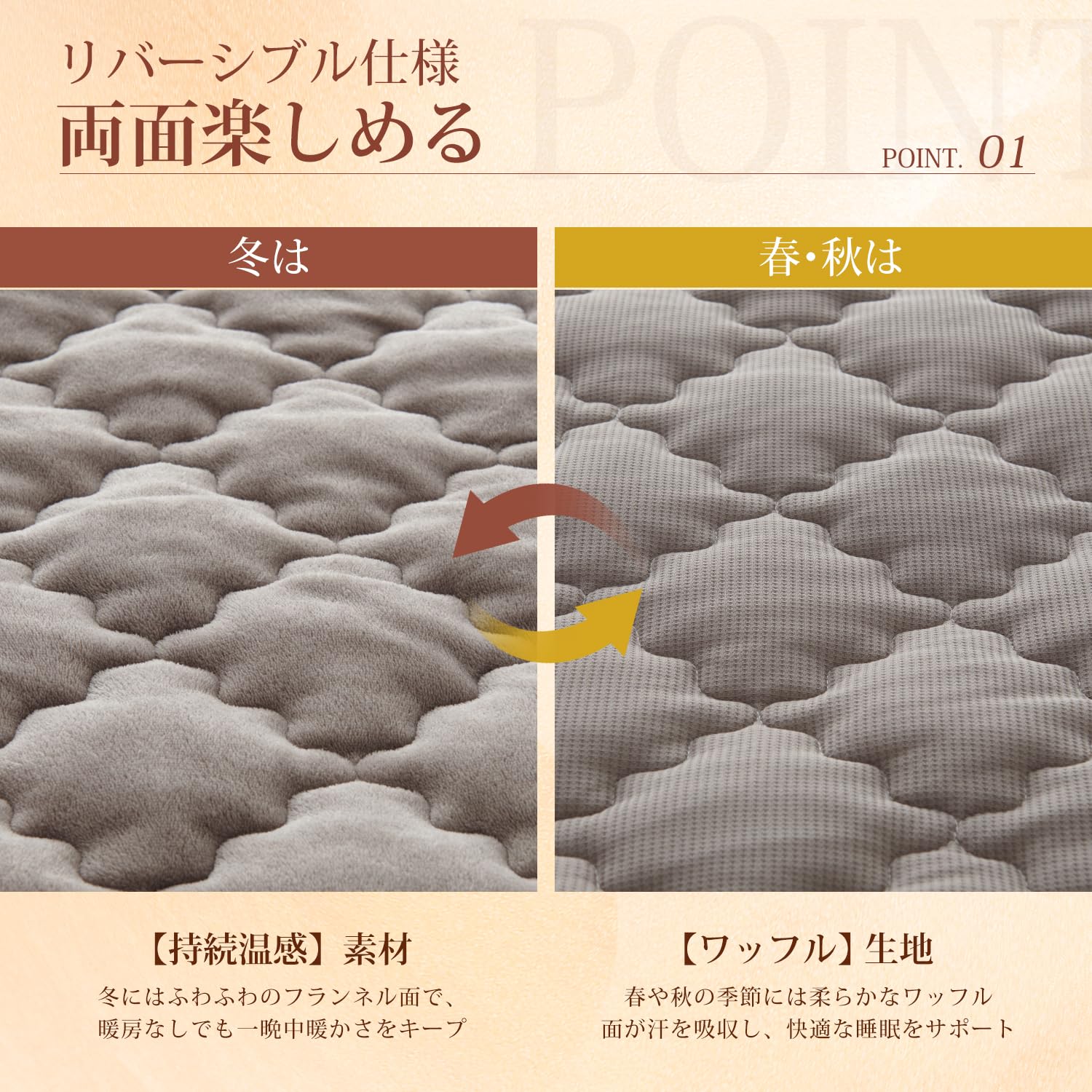 「リバーシブルで両面楽しめる」肌寒い時には柔らかくて暖かいフランネル面を、暑さや湿気を感じた時にはワッフル面を使えます。気候や気分に合わせて、表と裏を使い分けることで、1枚で快適に過ごせます!