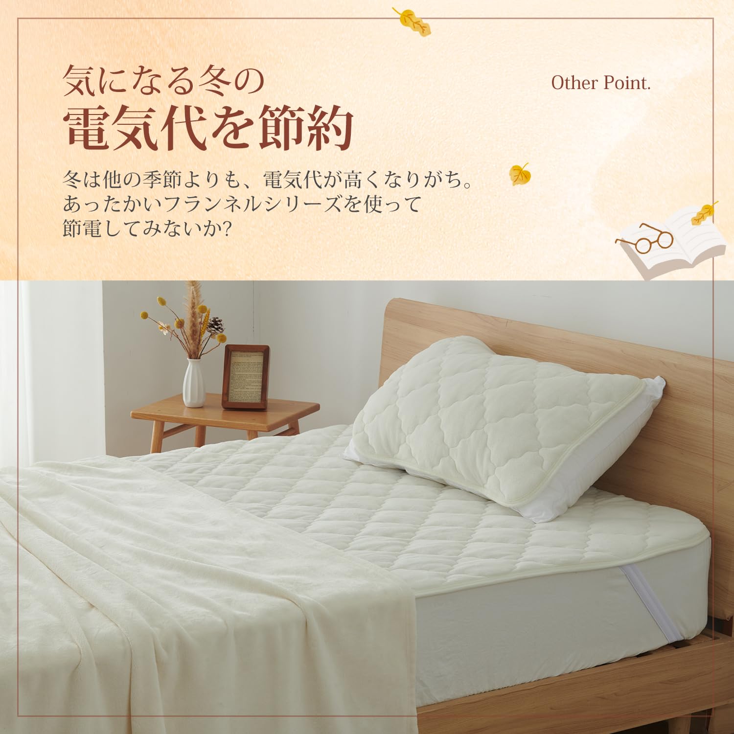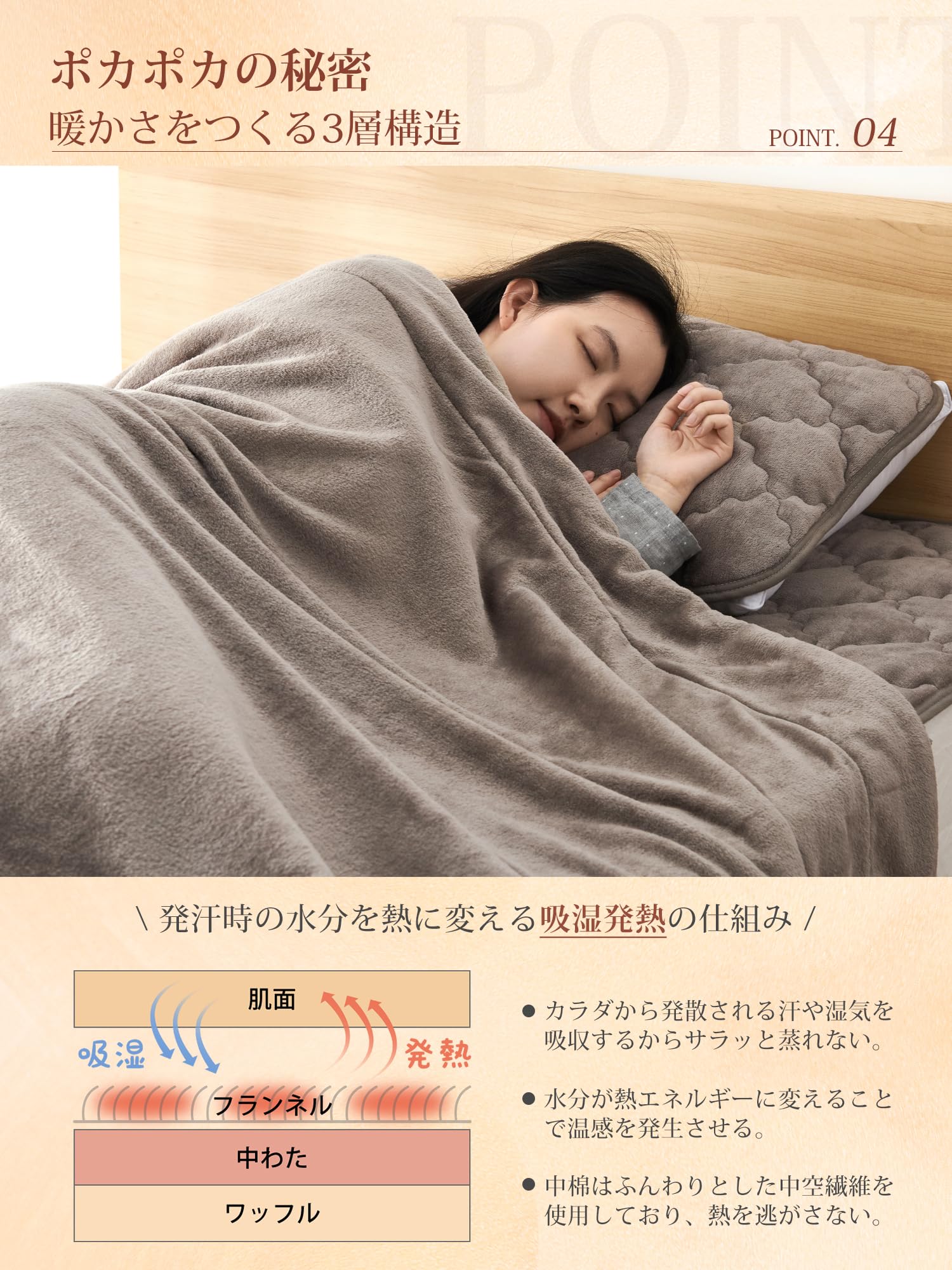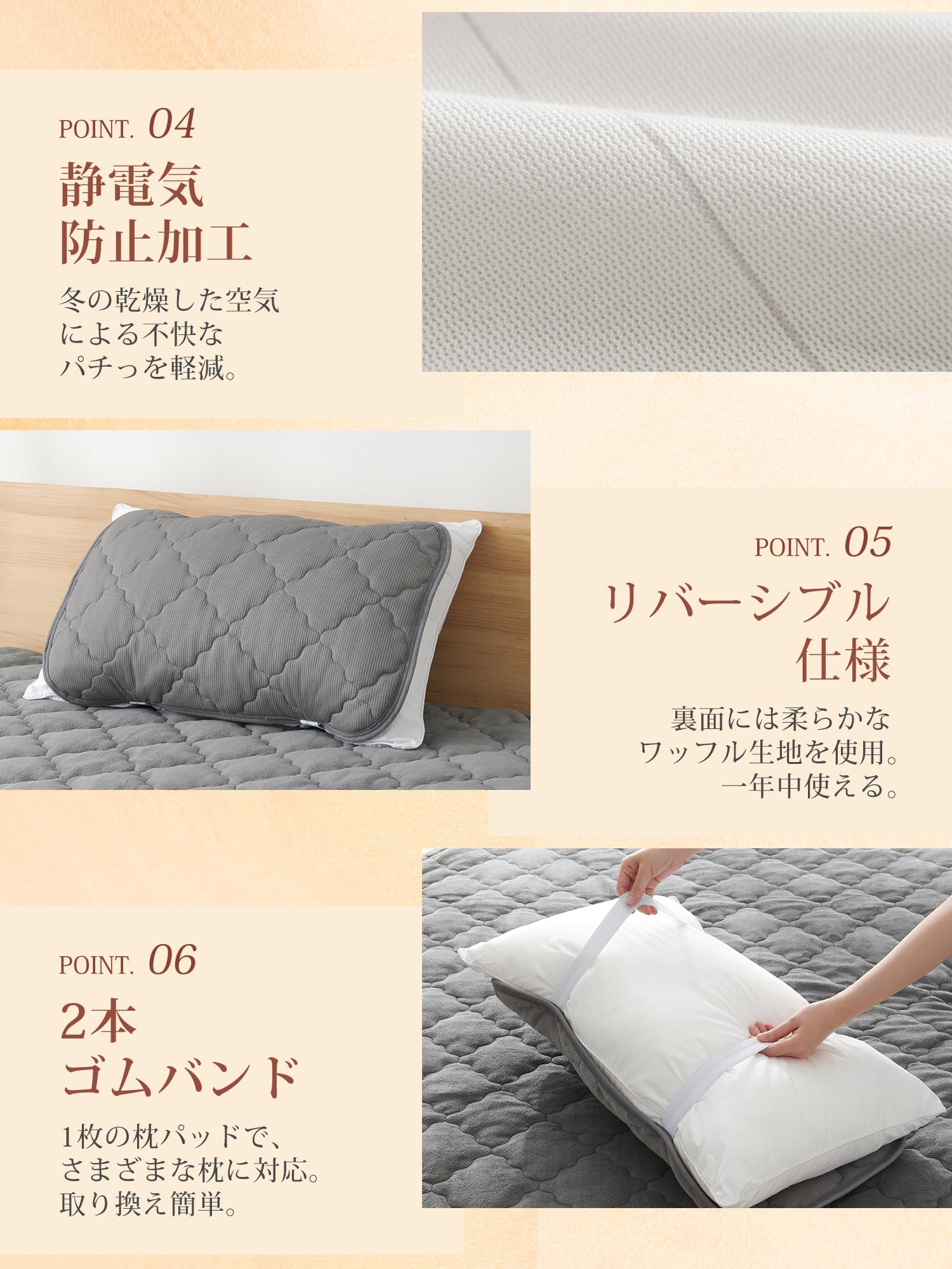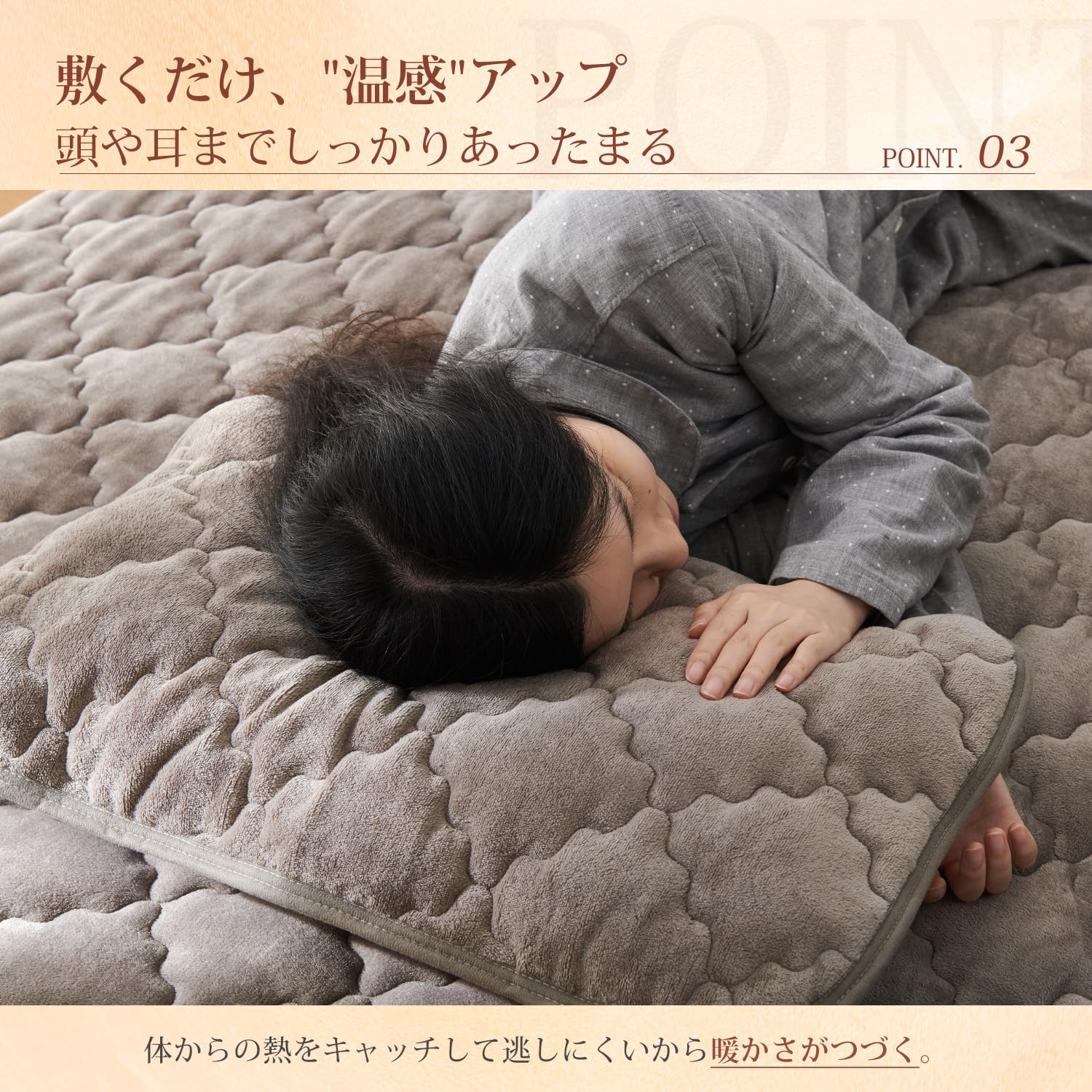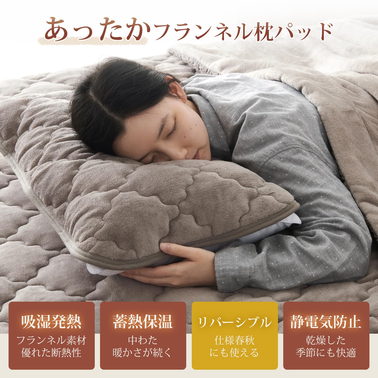 「持続温感枕パッド」フランネル面は柔らかく、厳冬でも頭に触れた瞬間にひんやりしません。マイクロファイバーを使用しているため、細かい繊維の間に空気を取り込み、暖かい空気を逃がさずに保ちます。さらに、蓄熱わたは体から発生する湿気を熱に変え、持続的な暖かさを実現します。