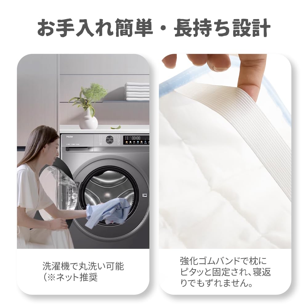 【ゴム付きでずれにくい設計】枕にしっかりフィットするゴムバンド付き。寝返りを打ってもずれにくく、ストレスフリーな安眠をサポート。