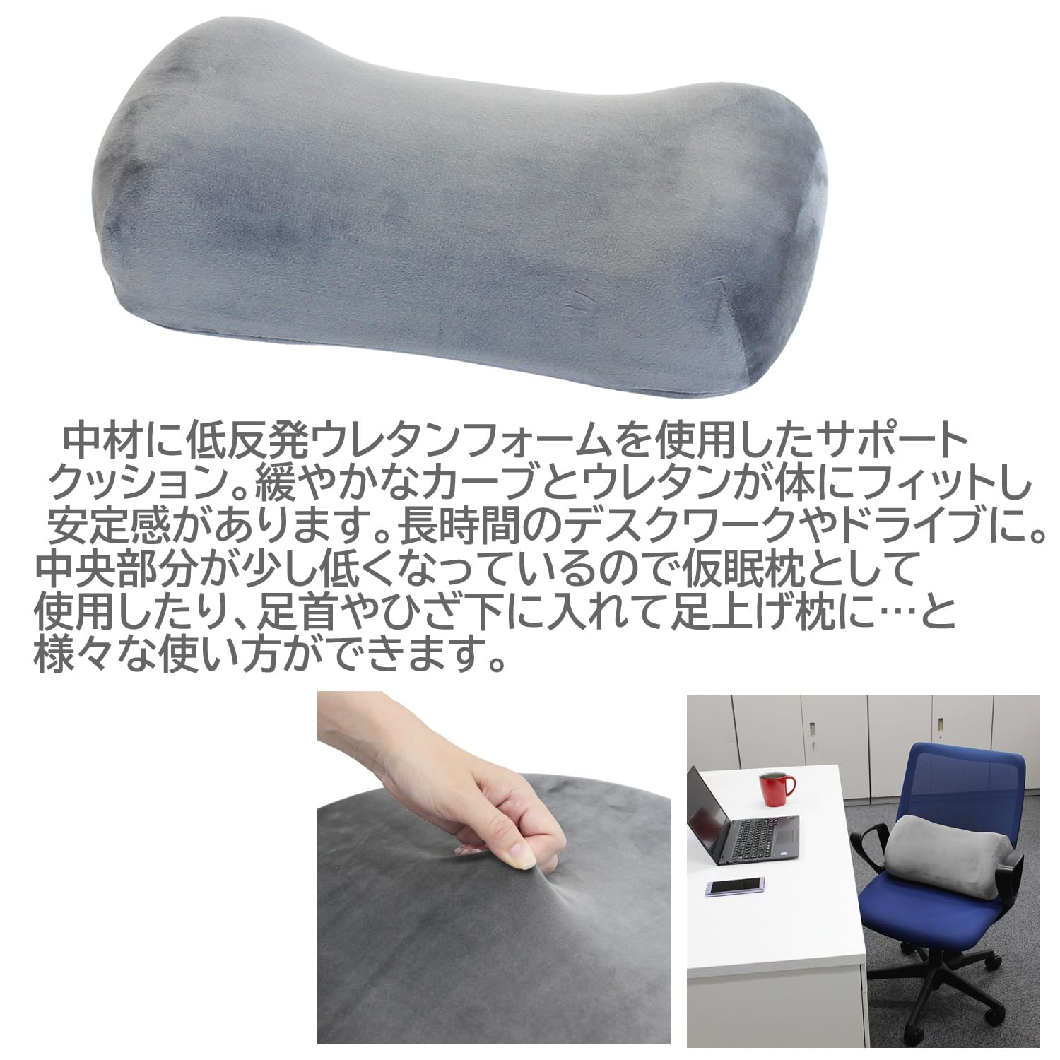 腰枕として使用の他、仮眠枕や足枕など様々なシーンで使用できる。