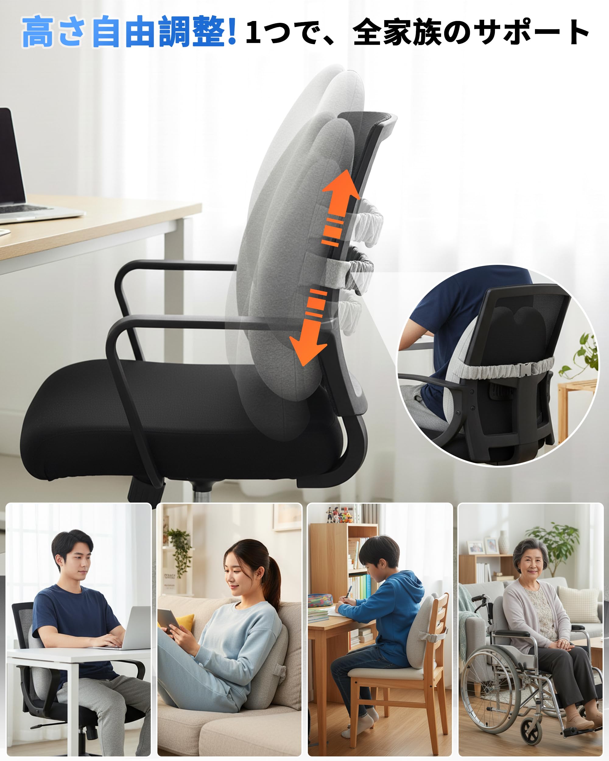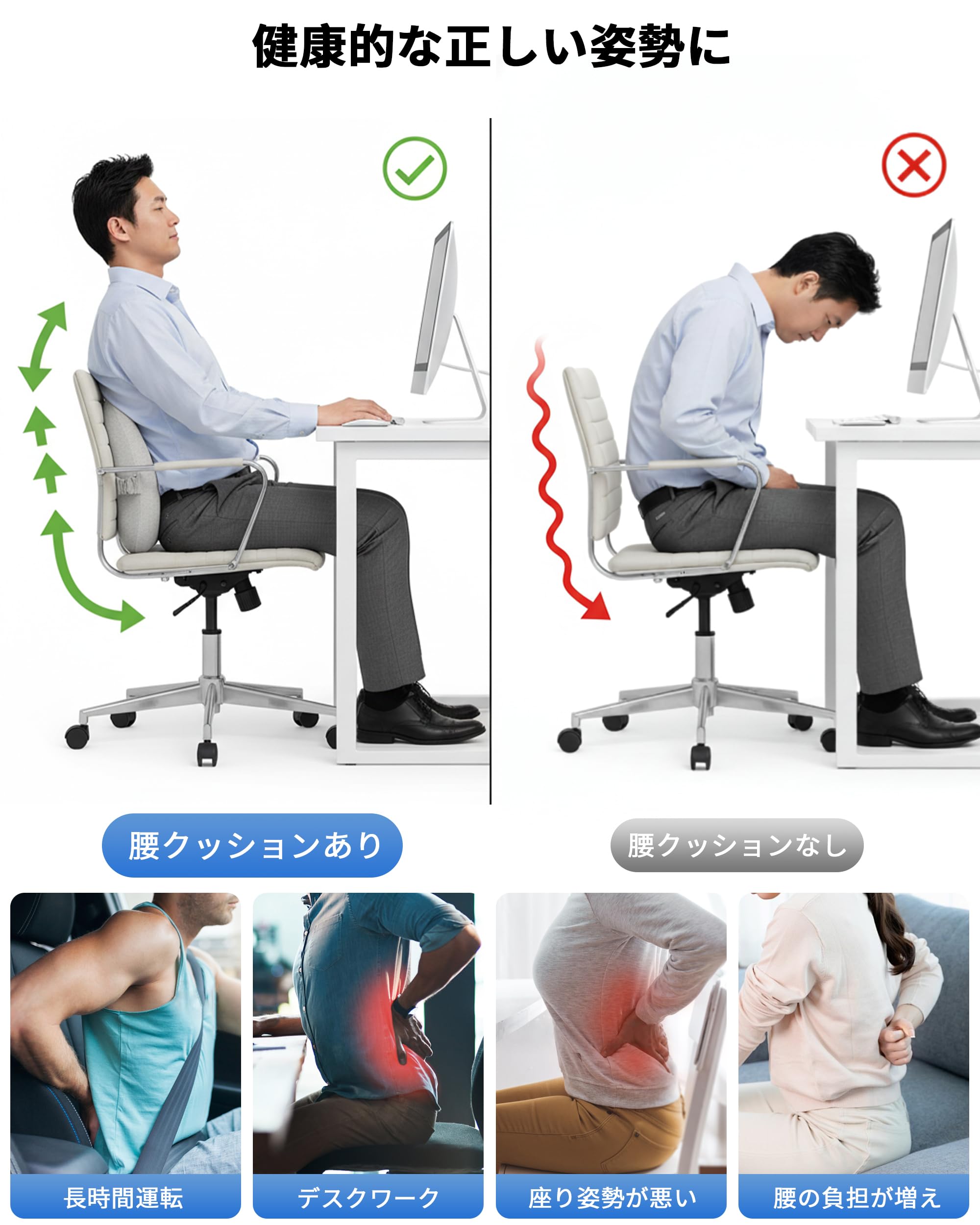 【体圧分散設計で 尾骨まで楽に】腰を支えるだけでなく、座った時に生じる尾骨周辺の圧力も広く分散。腰からお尻にかけての負担を和らげ、よりリラックスした状態で座り続けることができます。椅子と腰部の隙間を効果的に埋めることで、猫背を防ぎ、自然に背筋が伸びる健康的な姿勢をキープします。