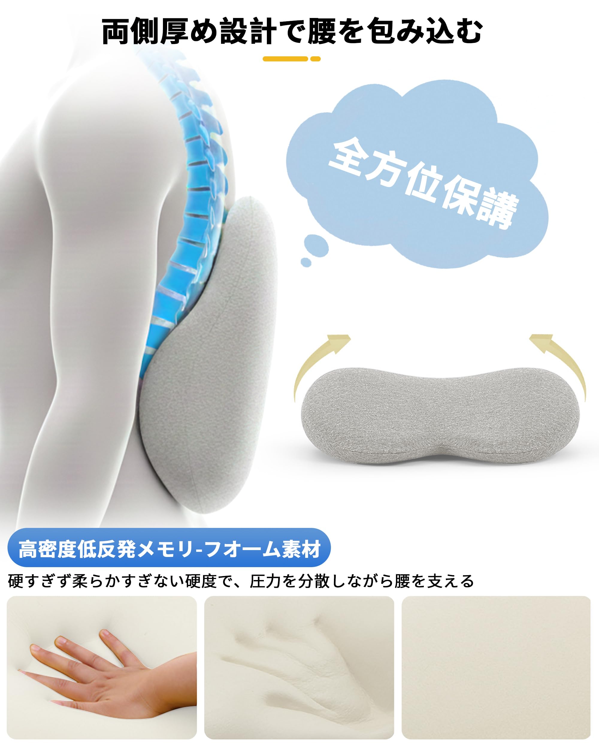【高密度低反発 メモリーフォーム採用】高密度で優れた支?力を持つ50D低反発メモリーフォームを採用。体重に合わせてゆっくりと形を記憶し、腰にしっかりフィット。適度な反発力で腰を支えるため、沈みすぎず、硬すぎない、長時間快適な座り心地を実現します。また、耐久性に優れ、長期間使用しても型崩れしにくい特長があります。
