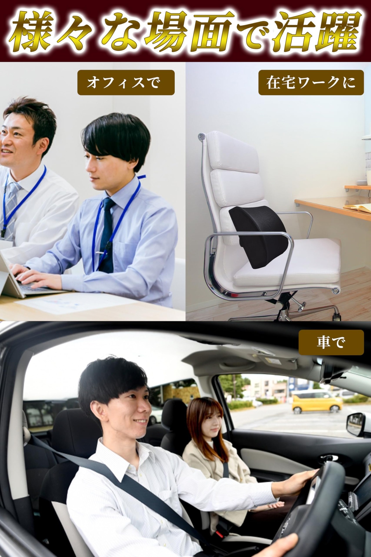 【正しい姿勢をサポート】椅子に装着することで、デスクワークや長時間の座り作業において、正しい姿勢をサポートします。