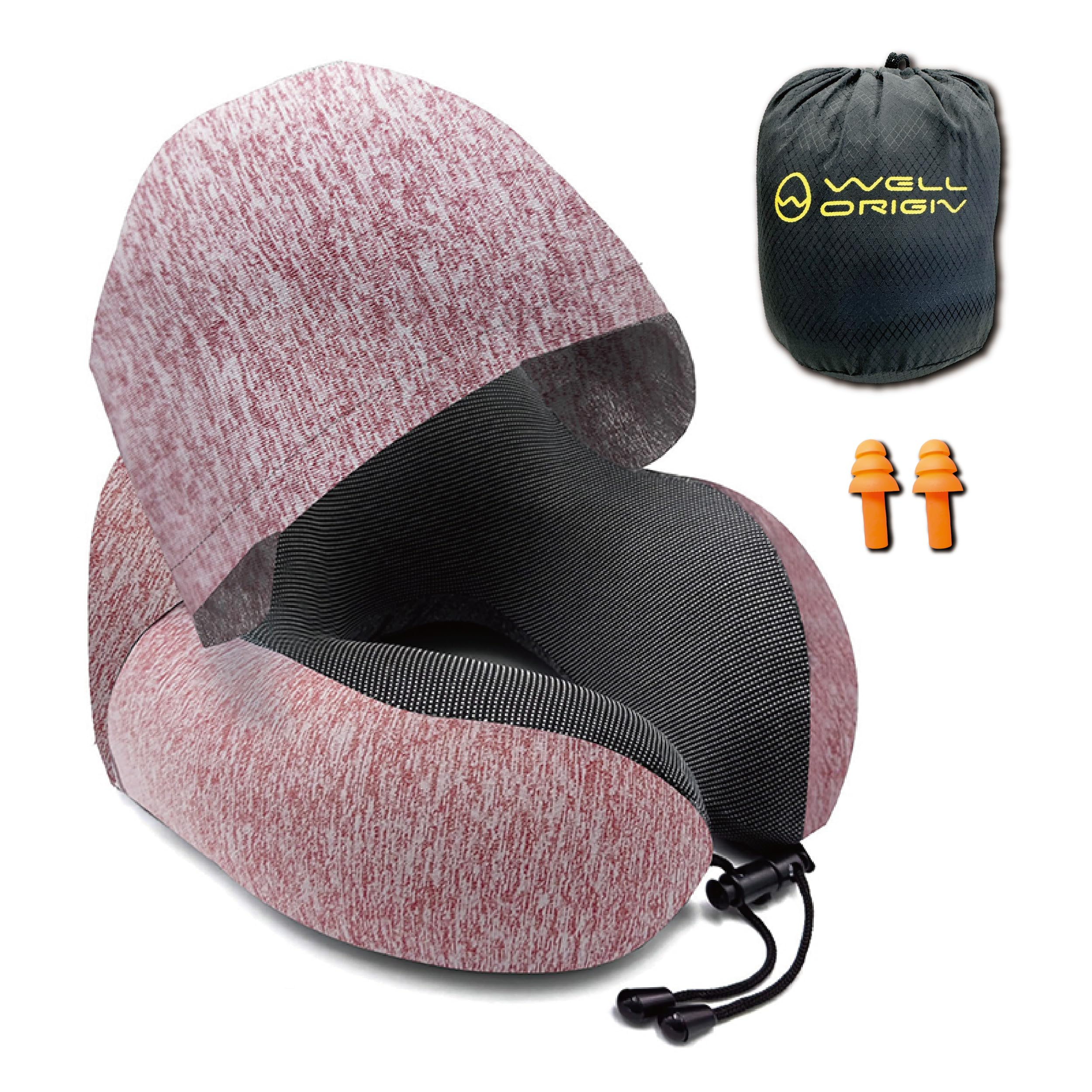 [WellOrigin] ネックピロー フード付き 低反発 メモリーフォーム 首枕 携帯枕 収納袋付き 飛行機 旅行 寝顔を隠せる 目元を隠せる 洗える 人間工学に基づく設計 (レッド)