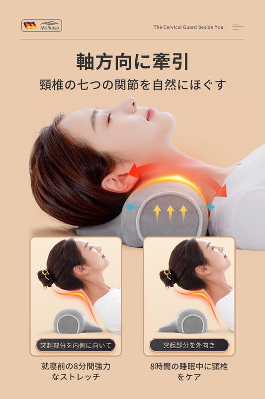 【二方向で使える】突起部分を内側に向いて 寝る前30分、頸椎の曲度をストレッチ、自然に頸椎をストレッチ、元の曲度へ回復、突起部分を外向き 8時間深い睡眠へ、軸方向ストレッチ、一晩8時間快眠、曲度改善。