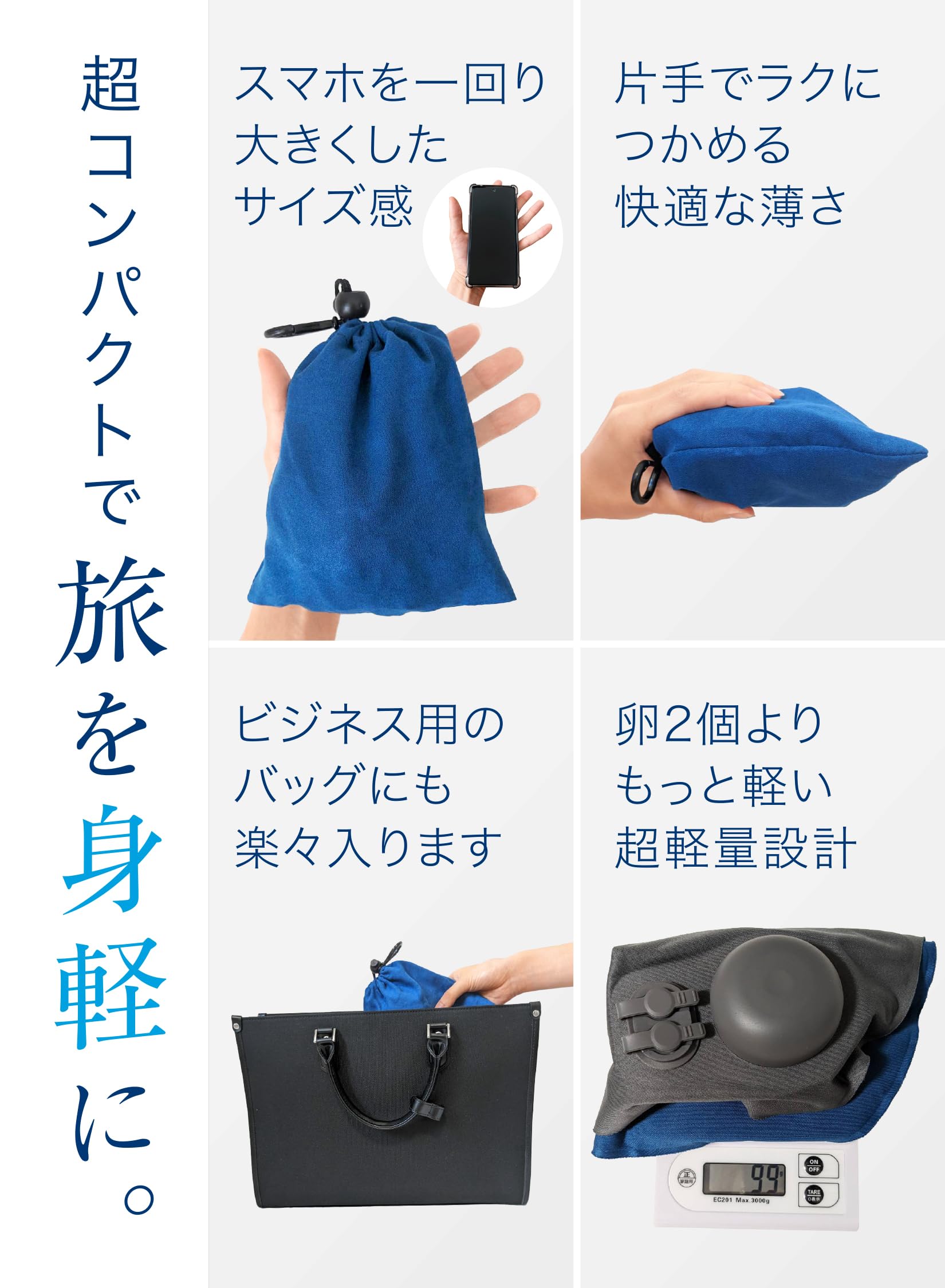 【飛行機での国内旅行に】超コンパクトに収納できるため、1〜2時間程度の国内旅行や出張に最適ですなぜなら、このピローは驚くほどにコンパクトに収納でき、片手サイズになるからですカバンにさっと入れられるサイズなので、荷物を最小限に抑えたいあなたの強い味方になります荷物は出来るだけ減らしたい、でも移動中にしっかり枕で休みたい-そんな時におすすめです「ミニマルU」があれば、移動時間がストレスからリフレッシュの時間へと変わります今までとは違う、新しい旅行のスタイルを体験してみませんか?