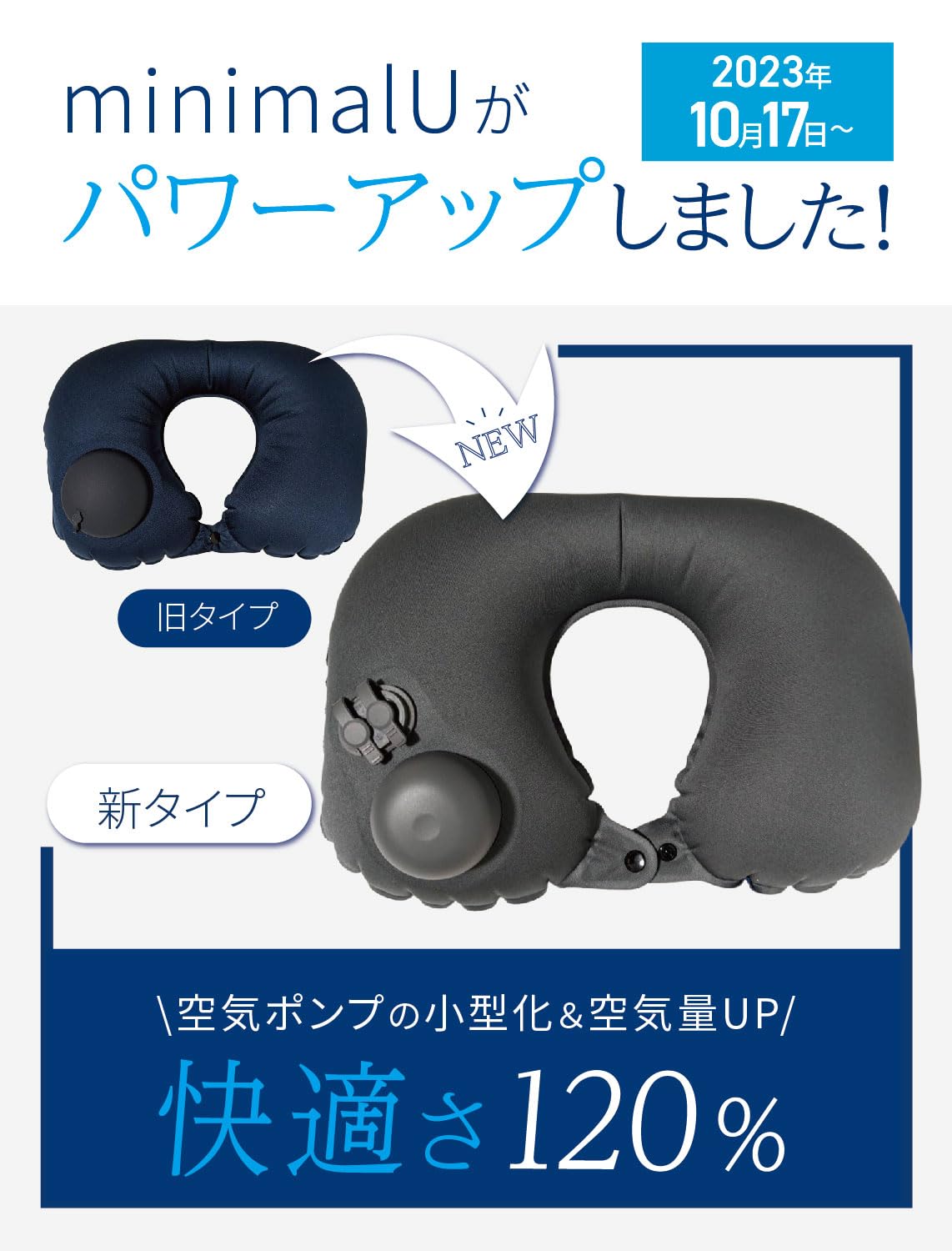 【口をつけない清潔仕様】空気を入れるのは大変そう思ったあなた、ご安心ください「ミニマルU」にはエアーポンプが本体に内蔵されていますなんと、これなら口を付ける必要なく、手でポンポンと押すだけで簡単に膨らみますもちろん、清潔さもバッチリまたお好みに空気を入れて膨らませることができるので、あなたのベストのネックピローに調節できます