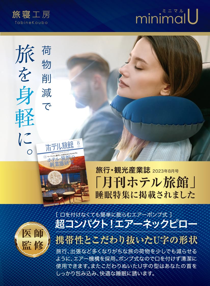 【医師監修】旅寝工房の「ミニマルU」ネックピローは、医師が監修した特別な型設計により、首元にしっかりとフィットします長時間の移動でも疲れにくく、首や肩への負担を軽減しますこれがあれば、飛行機での長距離旅行やビジネス出張はもちろん、夜行バスや車の移動中でも、さらには授業中やオフィスでのちょっとした昼寝もより質の高いリラックスタイムに変化させます小さなサイズで大きな安心感と快適さを提供する「ミニマルU」を、ぜひあなたの日常に