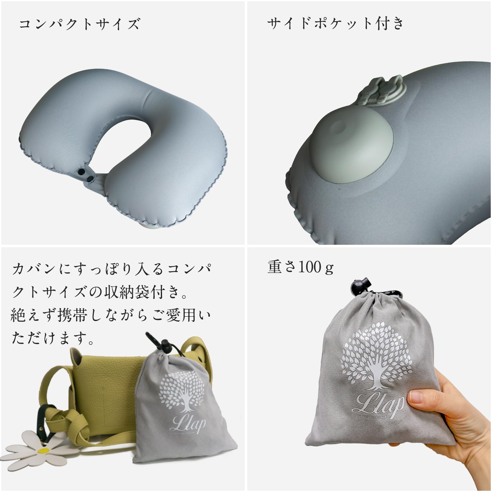 LLAP ネックピロー U型まくら コンパクト 携帯枕 U型 首枕 エアーピロー くびまくら 空気枕 携帯枕 軽量 旅行用 飛行機 トラベル 旅行枕 収納ポーチ付き (ダックグレー)