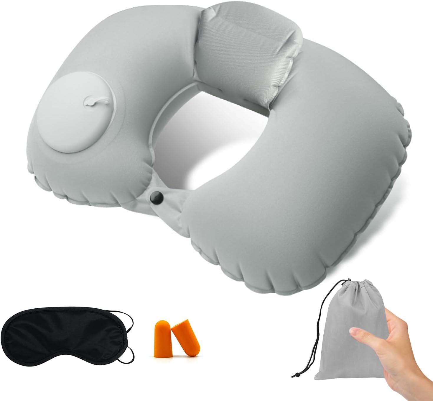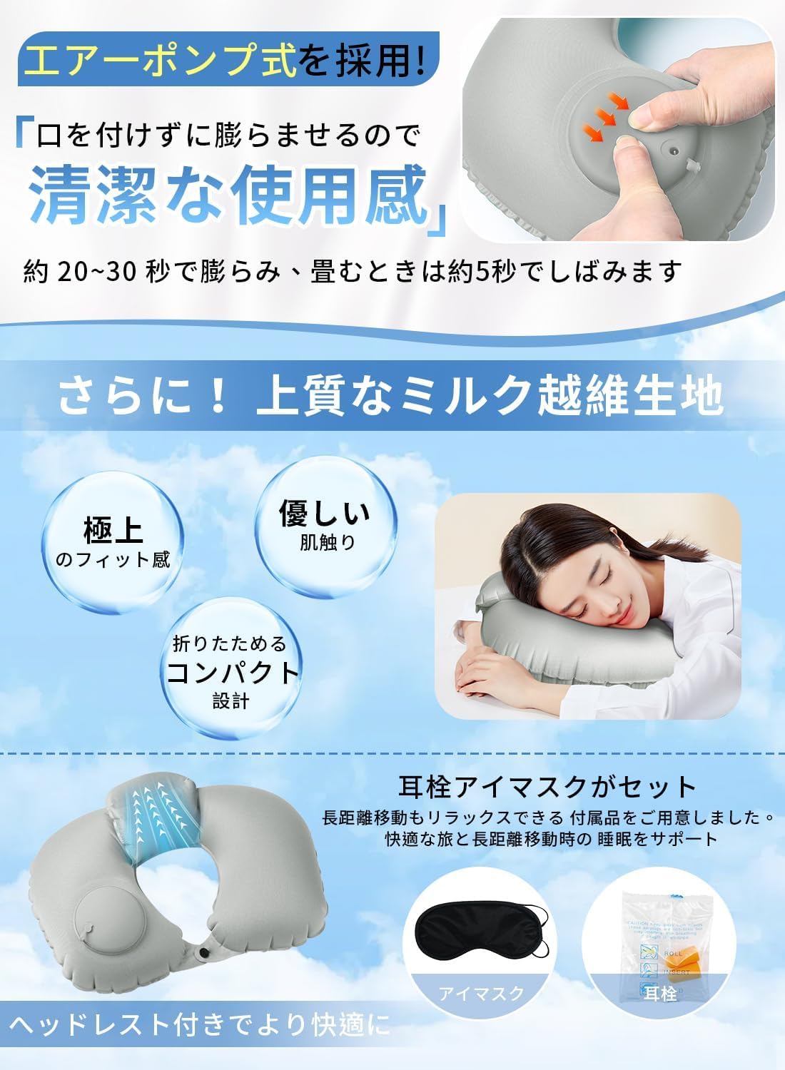 【セール】【・理学療法士監修】ネックピロー ポンプ式 U型まくら コンパクト 首枕 携帯枕 エアーピロー くびまくら 旅行用 (電車/飛行機/車などに) お昼寝 父の日 母の日 誕生日プレゼント neck pillow 超軽量 収納ポーチ アイマスク 耳栓付き(グレー) | GIGATERA