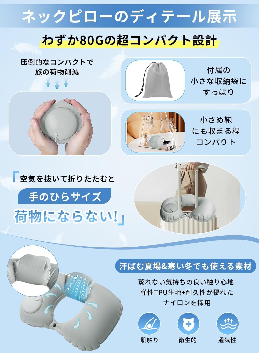 ??????【超軽量&コンパクト】エアータイプで畳むと手のひらサイズに収まるほどコンパクトに。収納時サイズは縦11cm×横幅11cm×厚さ5cmの超小型。展開時は横幅36cm×縦25cm×高さ10cmまで膨らみ、飛行機内での快眠をサポートします。携帯枕重さも約80g、荷物が嵩張らず、快適な移動や旅をお楽しみいただけます。
