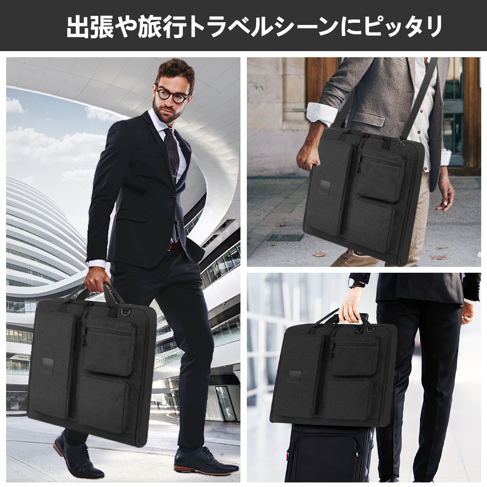 【洗練されたデザイン】一般的なガーメントバッグは、簡易な物で持ち歩きにくい。その為、「持ち歩きやすさ、デザイン、収納機能」に拘った一品。高級感のある素材と洗練されたデザインで、ビジネスマンにぴったりのガーメントバッグ。取り外し可能なショルダーベルト付き。ハンドタイプとショルダータイプの2wayで利用可能です。
