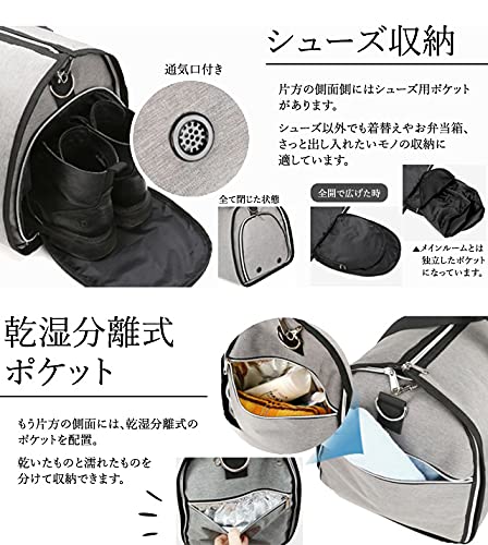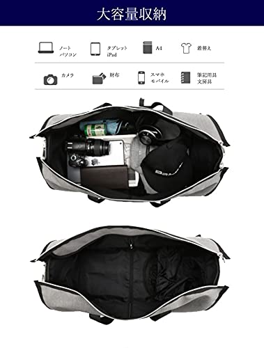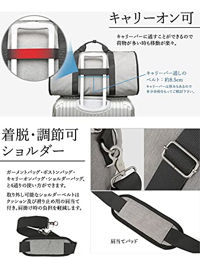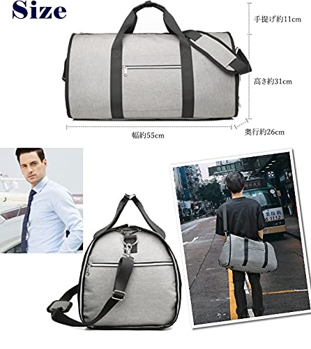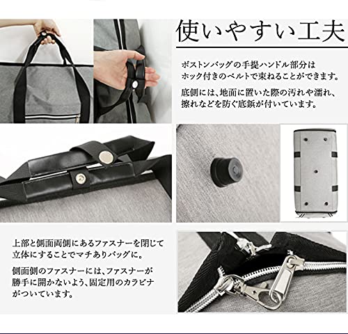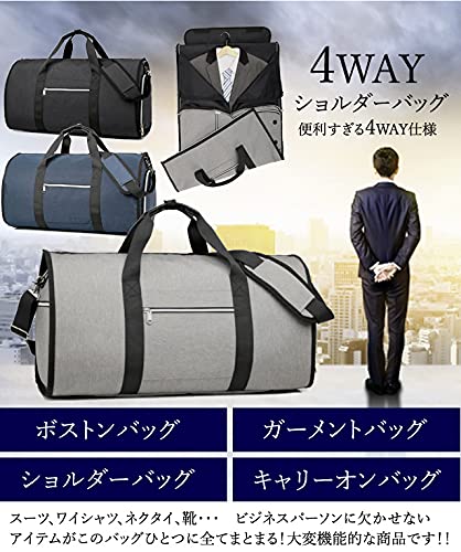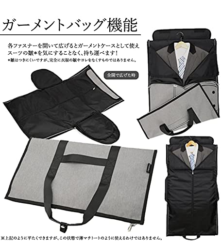 ・スーツ、ワイシャツ、ネクタイ、靴・・・ビジネスパーソンに欠かせないアイテムがこのバッグひとつに全てまとまる! 上部と側面のファスナーを開いて広げた状態にすると、ガーメントケースとして収納できます。 ファスナーを閉じて立体にすることでマチありバッグになる、大変機能的な商品です。 ・出張、冠婚葬祭、就活、面接等の際に、スーツの皺*を気にすることなく、持ち運べます! *皺はつきにくいですが、完全に衣服の皺やヨレをなくすものではありません。 ・片方の側面には乾湿分離式ポケットが付いており、乾いたものと濡れたものを分けて収納できます。 もう片方の側面側にはシューズ用ポケットがあり、シューズ以外も着替えやお弁当箱など、 分けておきたいものの収納に適しています。 どちらもファスナー開閉でサイドからさっと取り入れすることができて便利です。 ・スーツケース・キャリーバッグのキャリーバーに通すことができるので、長期出張で荷物が多い時も移動が楽々。 ショルダーベルトが付属しているので、ガーメントバッグ・ボストンバッグとしてのみならず、 ショルダーバッグ・キャリーオンバッグとして4通りの使い方ができます。 ・取り外し可能なショルダーベルトにはクッション及び滑り止め用の肩当て付き。 肩掛け時の負担を軽減します。 ・ボストンバッグの手提ハンドル部分はホック付きのベルトで束ねることができます。 ・底側には、地面に置いた際の汚れや濡れ、擦れなどを防ぐ底鋲が付いています。 側面両側のファスナーには、持ち運びの際に勝手に開かないよう、 ファスナー固定用のカラビナがついています。