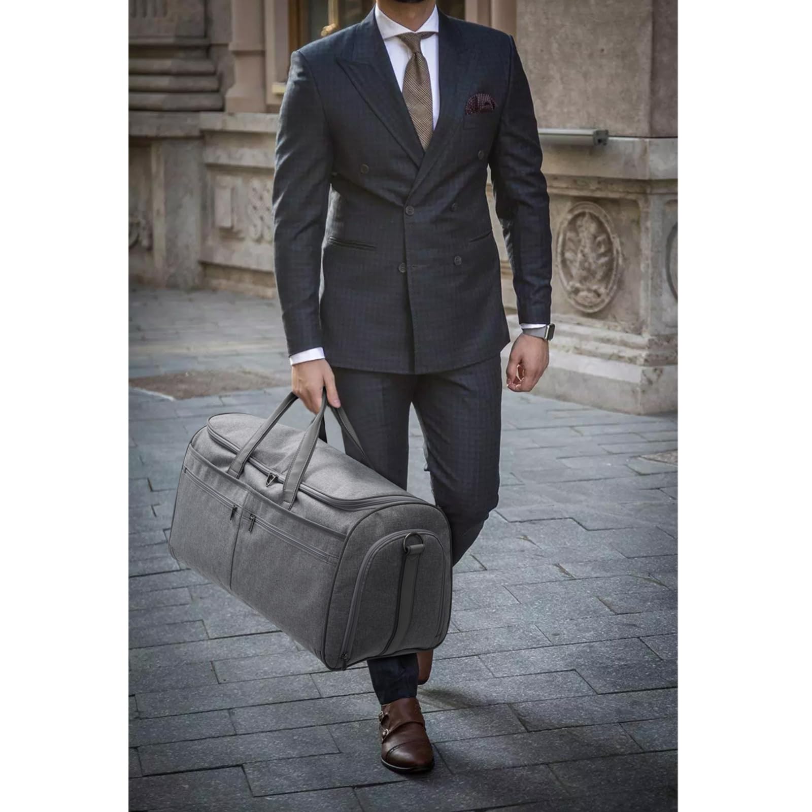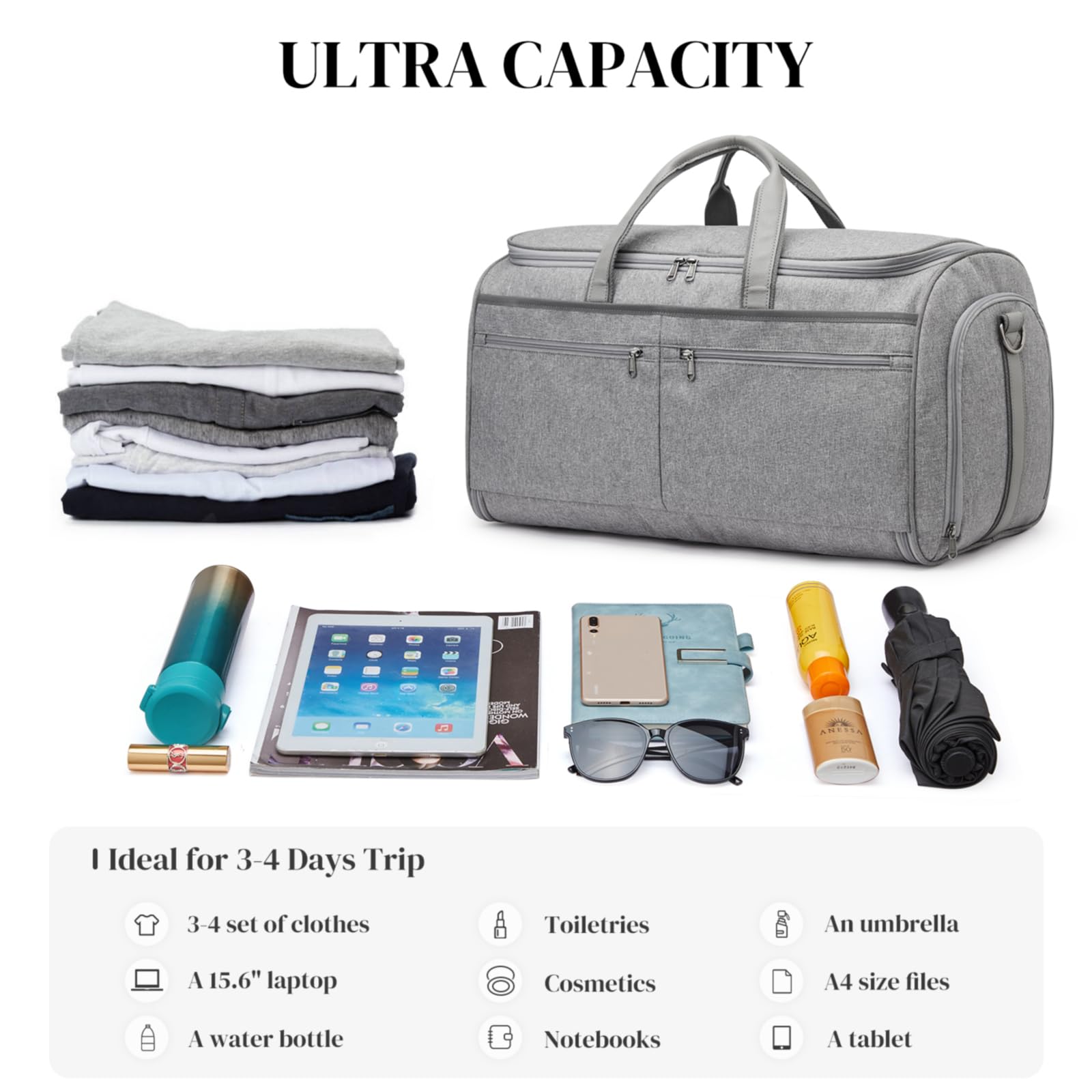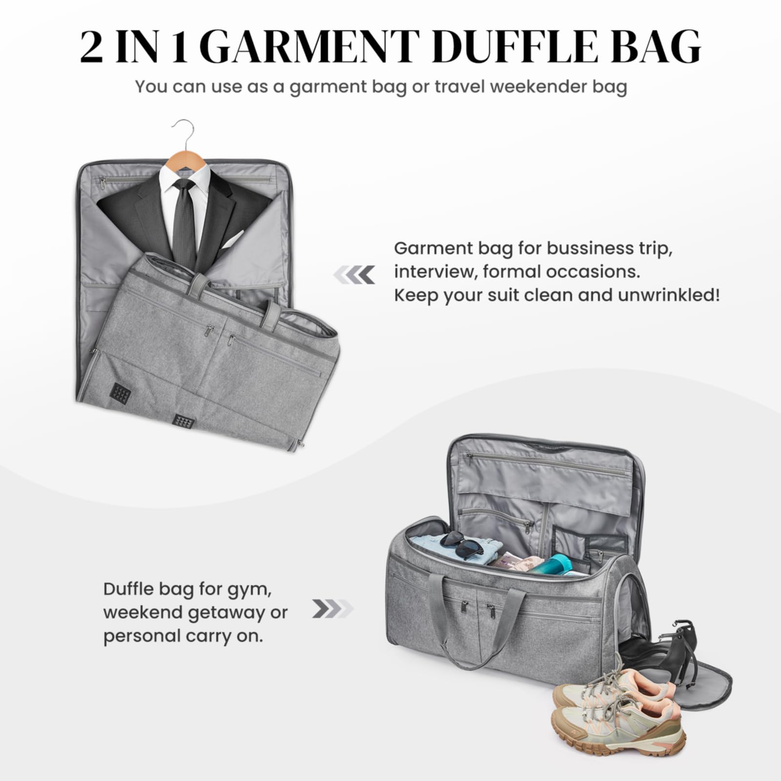 【2 in 1 ガーメントバッグ】:当社の旅行用ガーメントバッグは、ガーメントバッグと旅行用ダッフルバッグの機能を兼ね備えています。スーツやドレスを清潔できちんとした状態に保ち、しわにならないように特別に設計されています。内側のデュアルバックルが衣類を所定の位置に保持し、旅行中にしわやくしゃくしゃにならないようにします。フォーマルなパーティー、休暇、週末の旅行、またはツアーによく行く人に最適です。